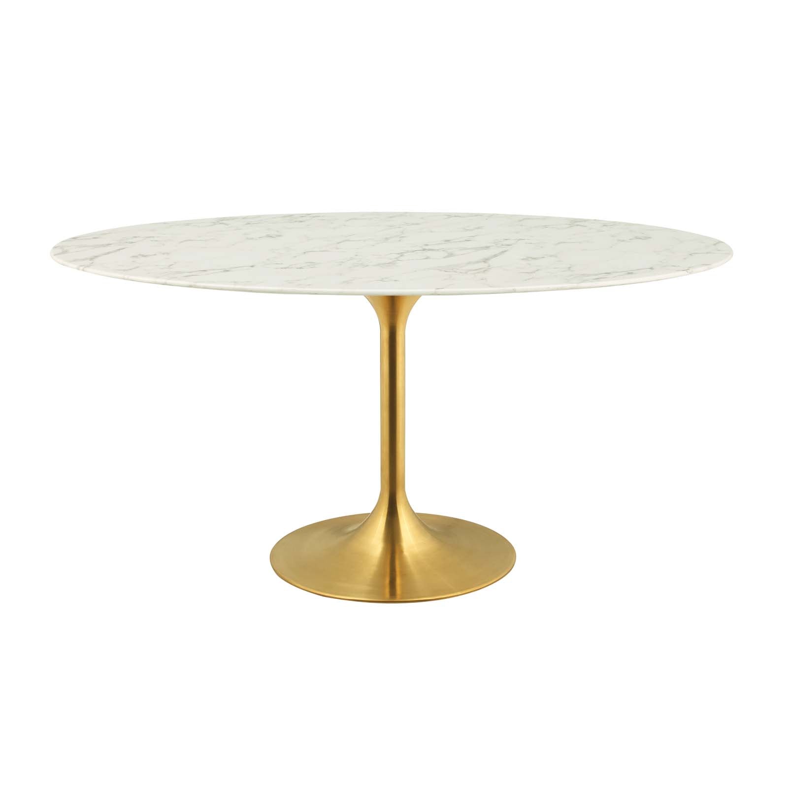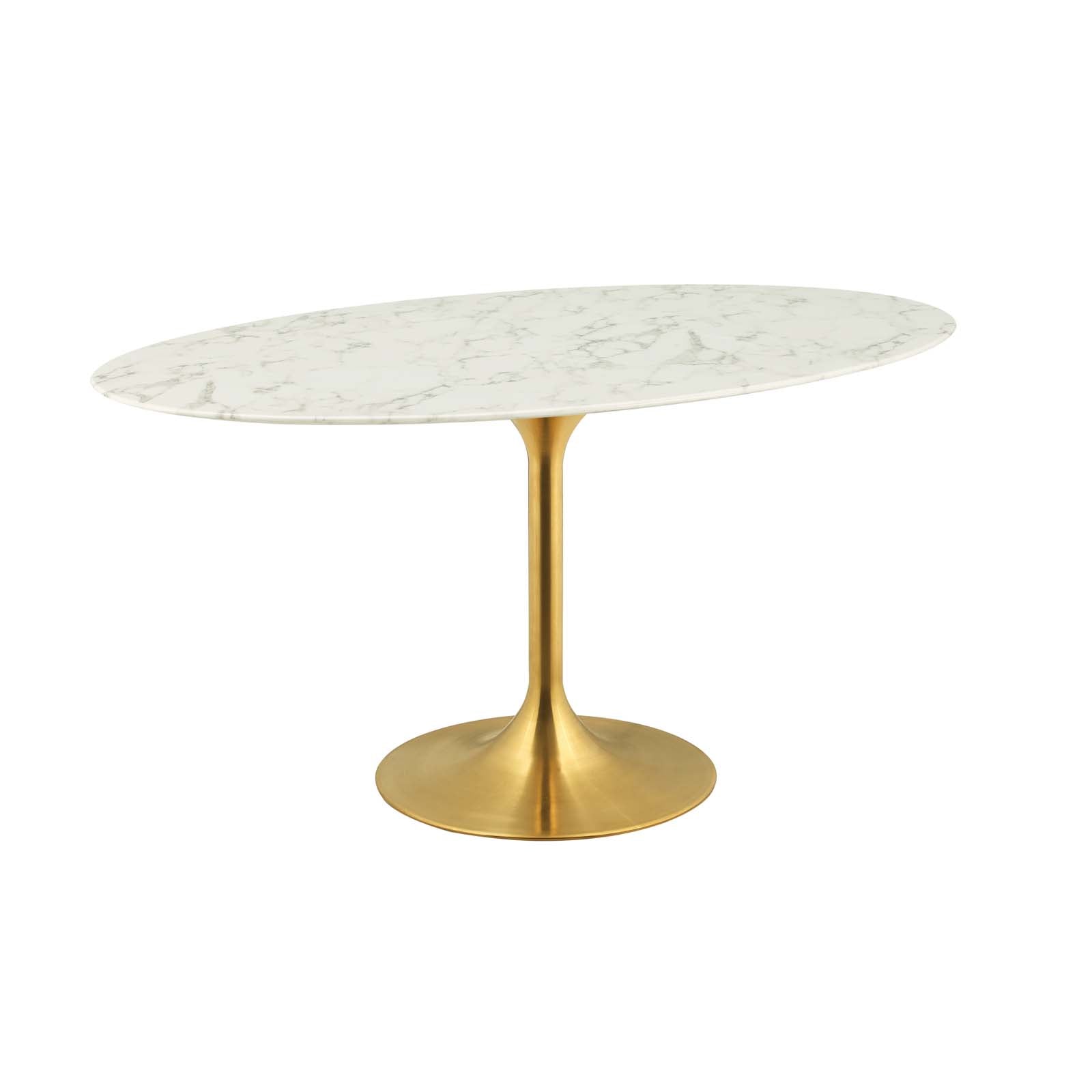 Let modern inspiration flow while gathered around the Lippa 60" Oval Artificial Marble Dining Table. Perfect for entertaining family and friends or everyday dining, this pedestal table comfortably seats six. Its oval tabletop is crafted with artificial marble and beveled edge for a contemporary yet timeless design. Embodying an iconic mid-century silhouette, this pedestal dining table floats on a sleek tapered metal pedestal base with a chip-resistant brushed gold finish. Includes non-marking felt pad to protect flooring. Assembly required.