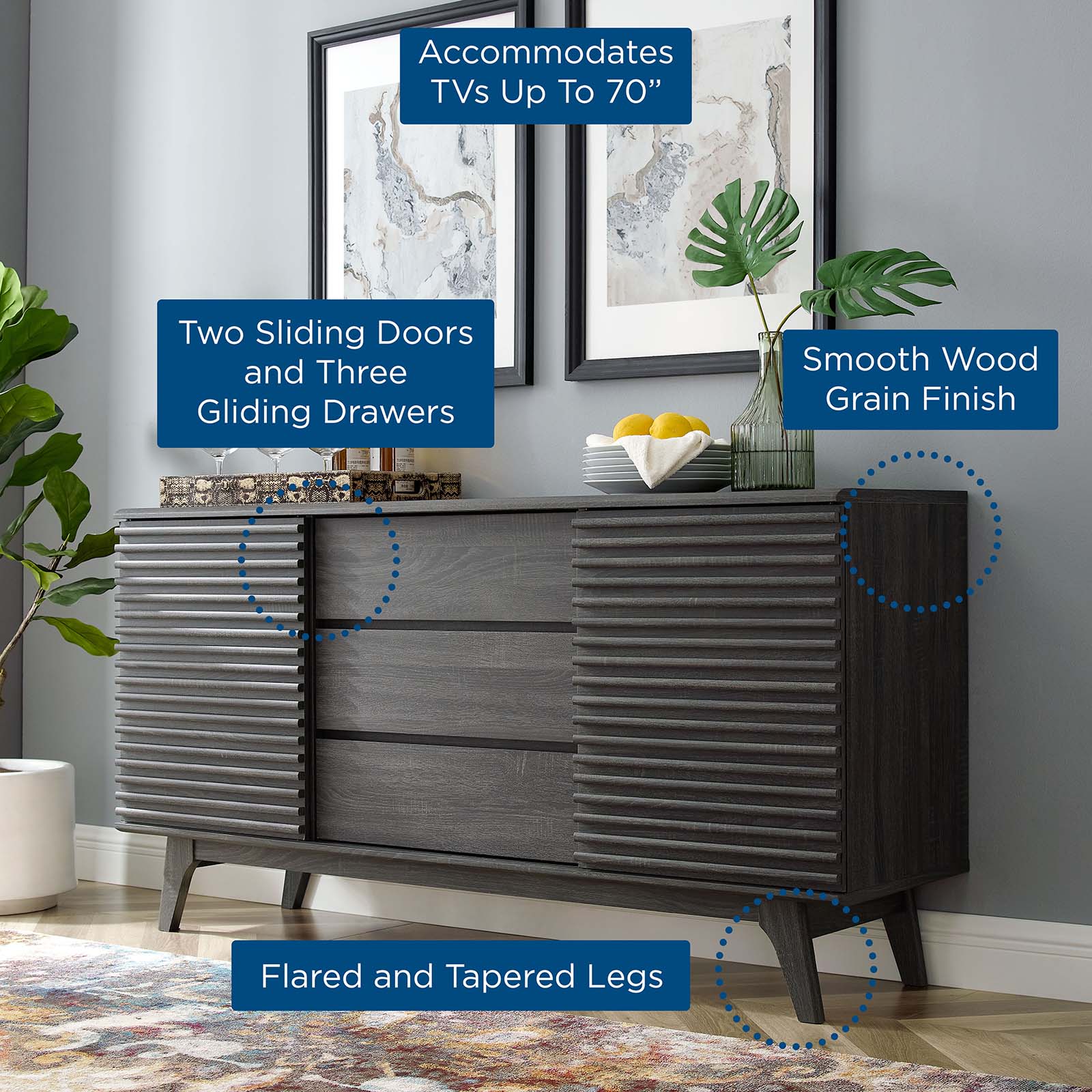Tap into mid-century aesthetics with the Render Sideboard Buffet Display Stand. This dining room buffet table features a durable particleboard frame with smooth walnut grain laminate, four tapered wood legs, an adjustable shelf on both sides, three center full-extension glide drawers, and two sliding doors for easy access to shelf storage. Render features an abundance of storage for your silverware, dishes, and other dining room finery. Boasting a mid-century modern style this accent serving table features a solid construction with a pleasing look and practical functionality. Perfect as a sideboard, credenza, buffet table, or display stand, Render also accommodates flat-screen TVs up to 70” wide as a living room or lounge area TV stand. Set Includes: One - Render 63" Sideboard Buffet Table or TV Stand