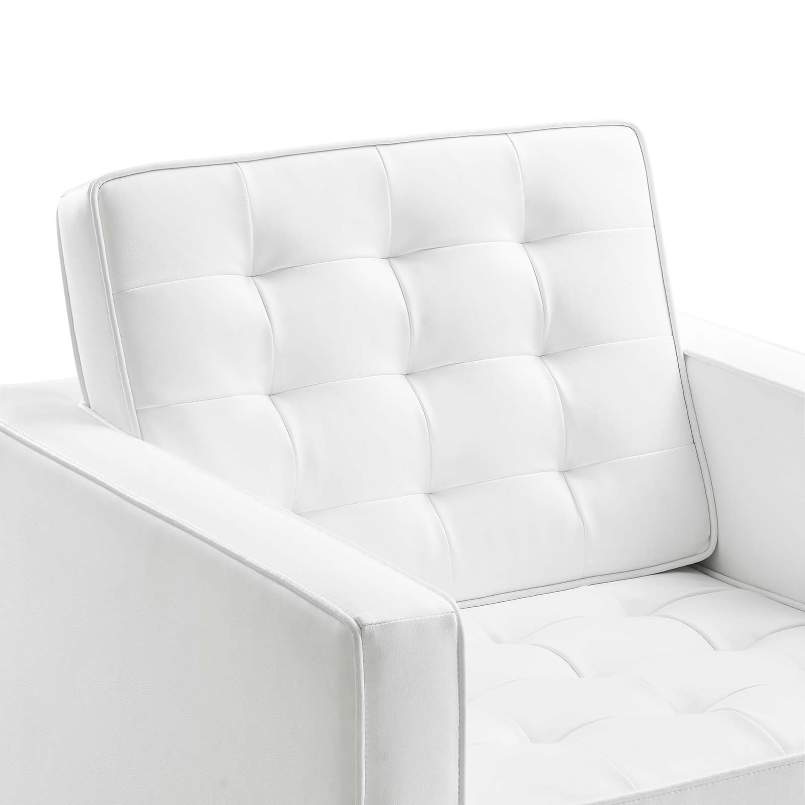 Revolutionize your living room furniture with the iconic Loft Vegan Leather Armchair. Adding visual depth to your living room or lounge space, Loft features soft and durable vegan leather upholstery accented with classic biscuit tufting. This modern accent chair showcases a captivating linear design, tubular stainless steel legs, and non-marking foot caps that protect flooring. Inspired by the richness of mid-century modern style, this upholstered chair is an ideal choice for living rooms, office reception areas, and lounge spaces. Armchair Weight Capacity: 330 lbs.