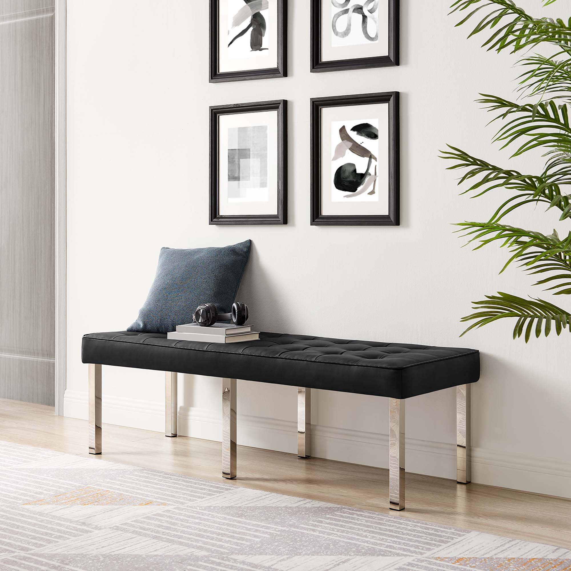 Revolutionize your living room furniture with the iconic Loft Vegan Leather Bench. Adding visual depth to your living room or lounge space, Loft features soft and durable vegan leather upholstery accented with classic biscuit tufting. This modern accent bench showcases a captivating linear design, tubular stainless steel legs, and non-marking foot caps that protect flooring. Inspired by the richness of mid-century modern style, this upholstered bench is an ideal choice for living rooms, office reception areas, and lounge spaces. Bench Weight Capacity: 660 lbs.