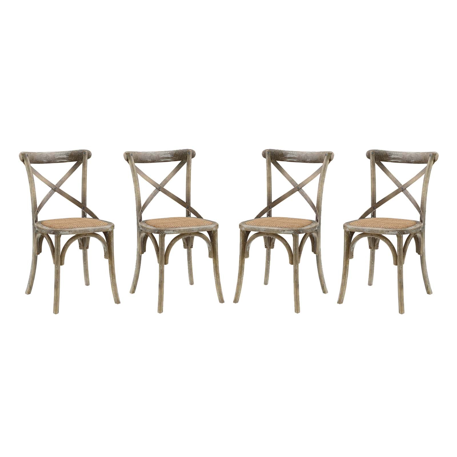 Evoke rustic remembrances as you sip a leisurely tea or hearty breakfast.With an open wooden backrest and tapered legs, the chair provides that country charm without compromising on modernity. The chair comes fully assembled and is a pleasant addition to country cottages, rustic environs, or any urban dweller in search of a respite. Set Includes: Four - Gear Dining Side Chair