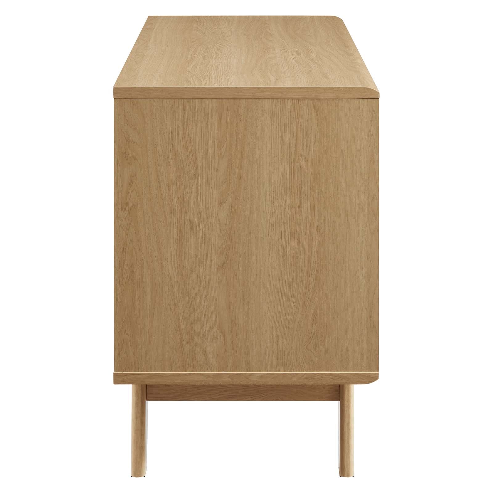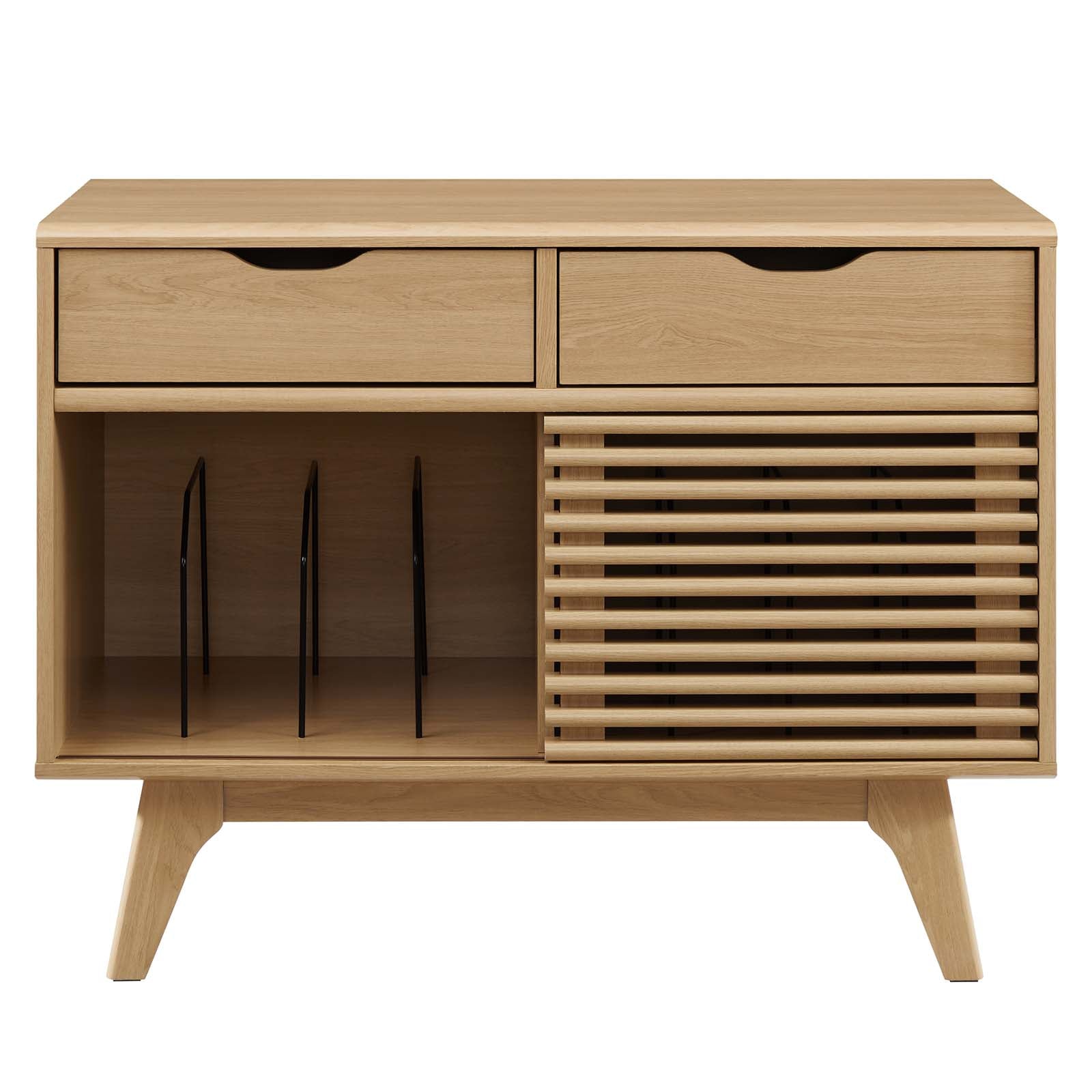 Tap into mid-century aesthetics with the Render Vinyl Record Display Stand. Render features a durable particleboard frame with walnut grain laminate, four tapered wood legs, and non-marking foam foot pads. A sliding slatted door and two top drawers offer ample storage space for your vinyl record collection and media essentials. Complete with metal dividers to keep records standing upright, RenderÕs contemporary linear style is the perfect addition to the modern living room, lounge space, bedroom, or recreation area. Set Includes: One - Render Vinyl Record Display Stand