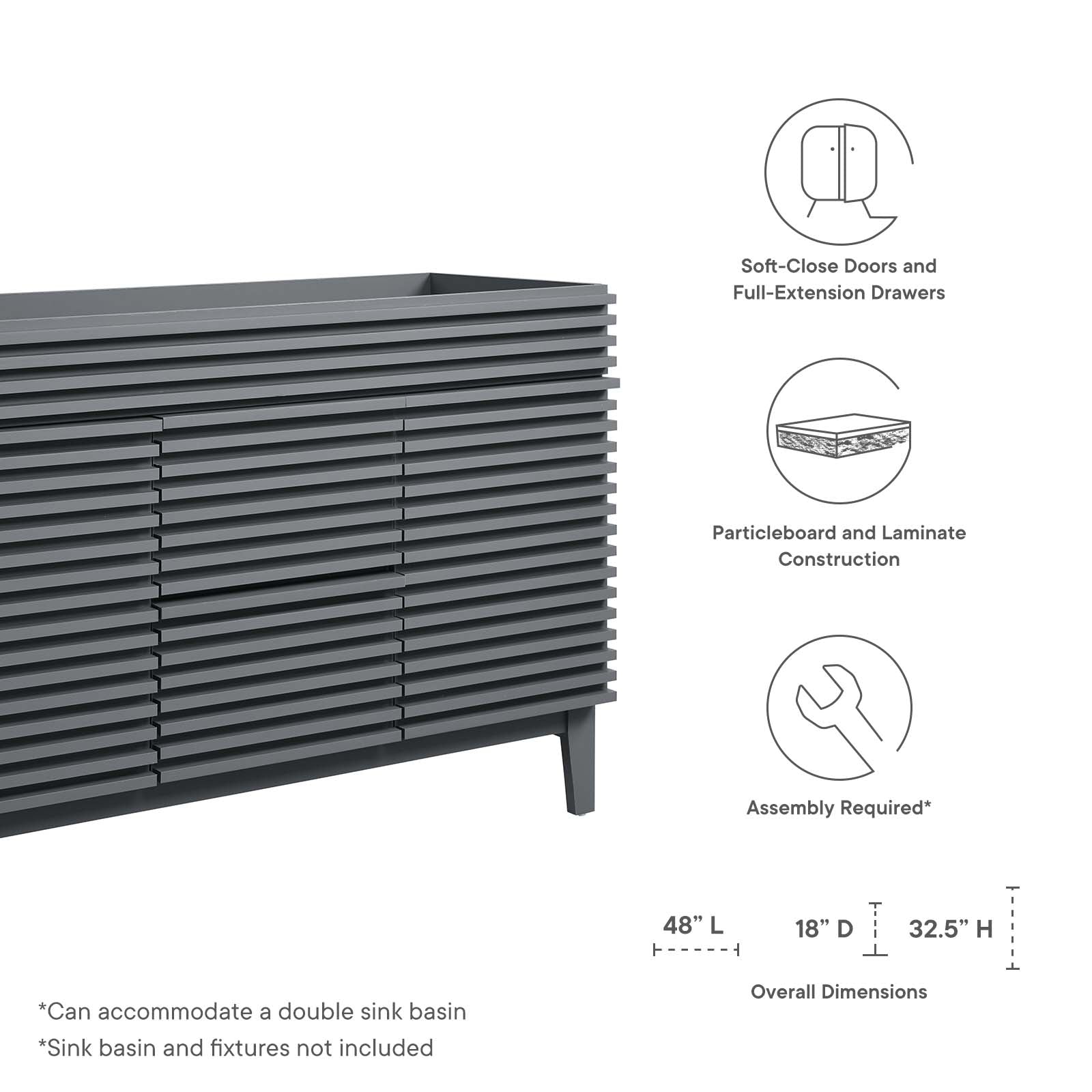 • Bullets: Mid-Century Modern Vanity Smooth Laminate MDF and Particleboard Full-Extension Drawers Soft-Close Doors Sink Basin and Fixtures Not Included