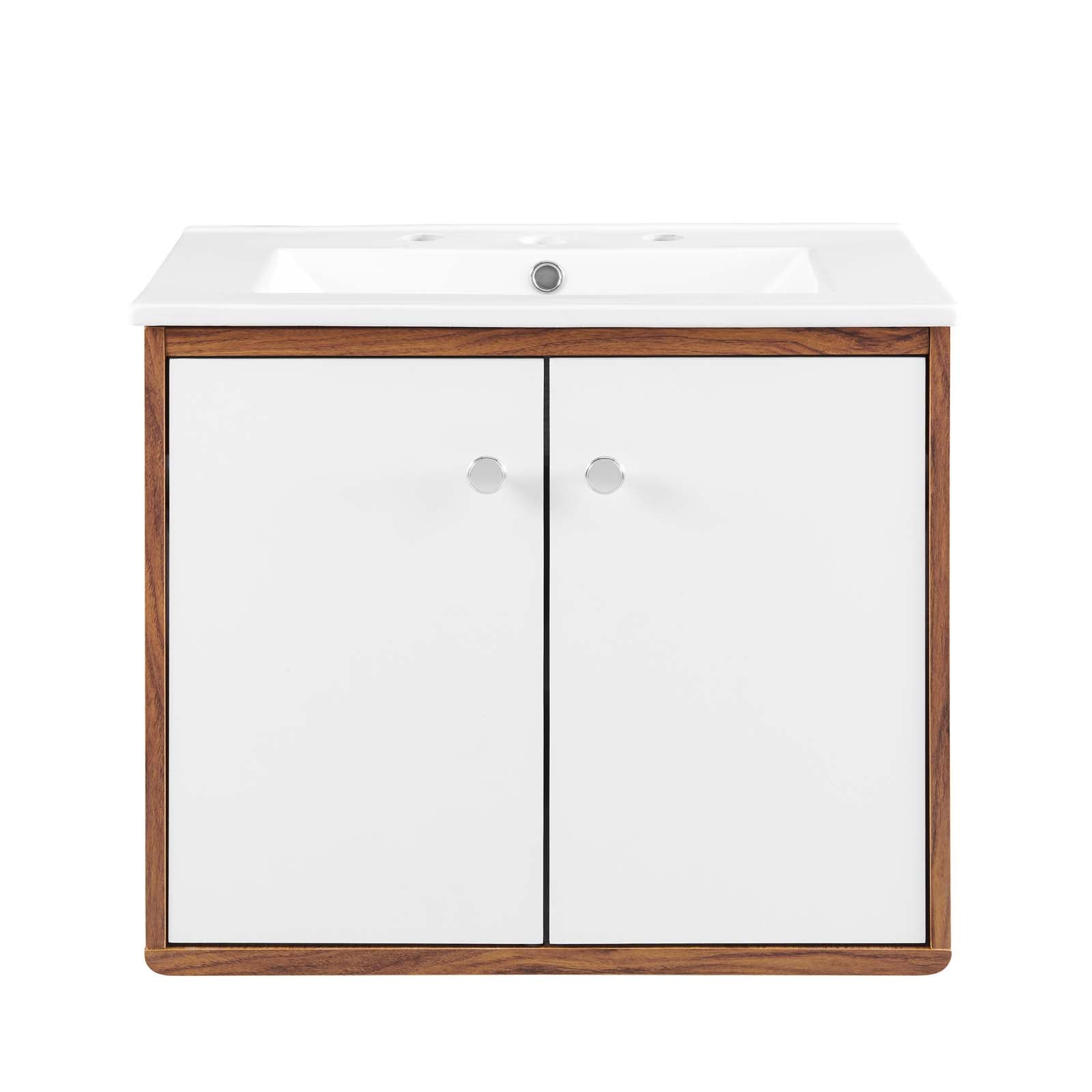 Bring mid-century modern aesthetics into the bathroom with the Transmit 24" Bathroom Vanity. This vanity features a durable particleboard and walnut grain veneer construction with ample storage space for all your bathroom essentials behind two white lacquered soft-close hinged doors. A ceramic sink with an integrated countertop, 8" centerset, and rectangular sink basin continue the sleek look of this retro modern vanity. Complete with chrome knobs, this bathroom vanity mounts directly to the wall saving a substantial amount of floor space. Assembly required and sink fixtures not included. Set Includes: One - Transmit 24" Wall-Mount Bathroom Vanity