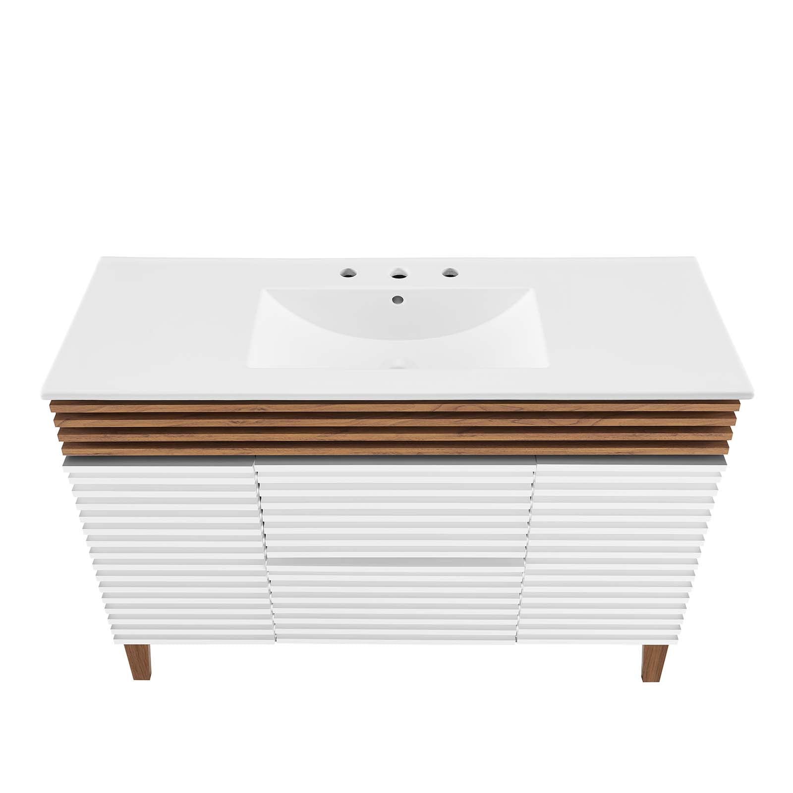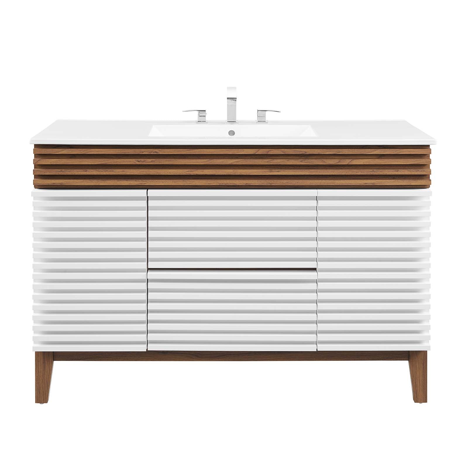 Tap into mid-century aesthetics with the Render Vanity. The Render 48" Bathroom Vanity features a durable MDF and particleboard frame with smooth walnut grain laminate, four tapered wood legs, and ample under sink storage space in full-extension drawers and behind soft-close hinged doors. Crafted with ceramic, a single sink with an integrated countertop, 8" widespread, and rectangular sink basin continue the sleek look of this retro modern vanity. Clean lines and crisp design align for an edgy style designed to meet your needs. Boasting a mid-century modern style this vanity features a solid construction with a pleasing look and practical functionality. Assembly required and fixtures not included. Set Includes: One - Render 48" Single Sink Bathroom Vanity