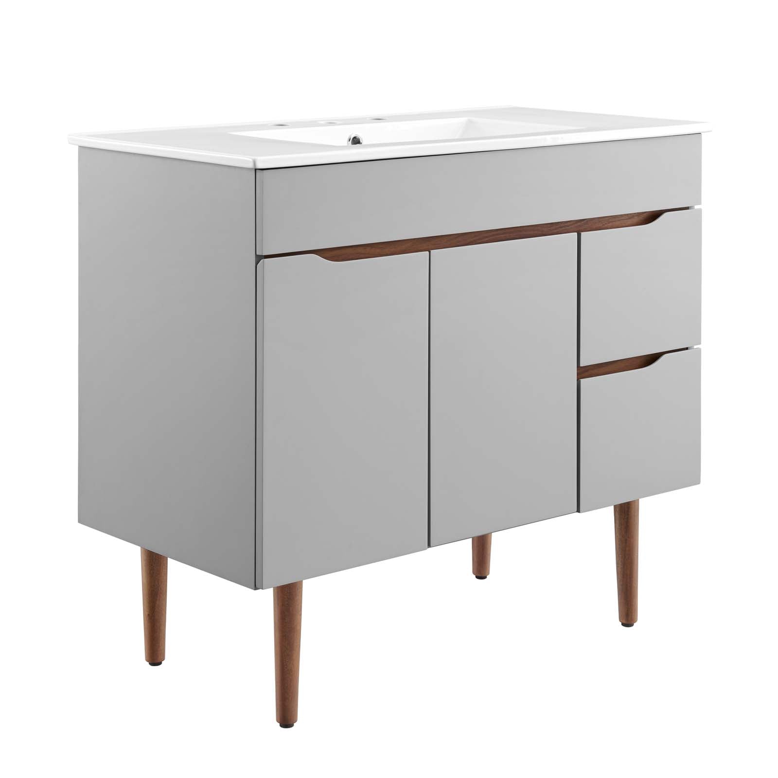 Instill the whispered elegance required to complete your bathroom decor with the Harvest 36" Mid-Century Modern Bathroom Vanity. The Harvest Bathroom Vanity features a durable MDF frame with a matte finish laminate, four tapered mahogany wood legs, two spacious drawers, and ample storage space behind two soft-close hinged doors. An integrated countertop and 8" centerset ceramic sink basin continue the sleek look with Scandinavian modern style design for a quietly bold vanity designed for a multitude of decor styles. This vanity features solid construction with a cutaway design on top of the dual doors and drawers for easy open and close functionality. Assembly required and fixtures not included. Set Includes: One - Harvest 36" Bathroom Vanity