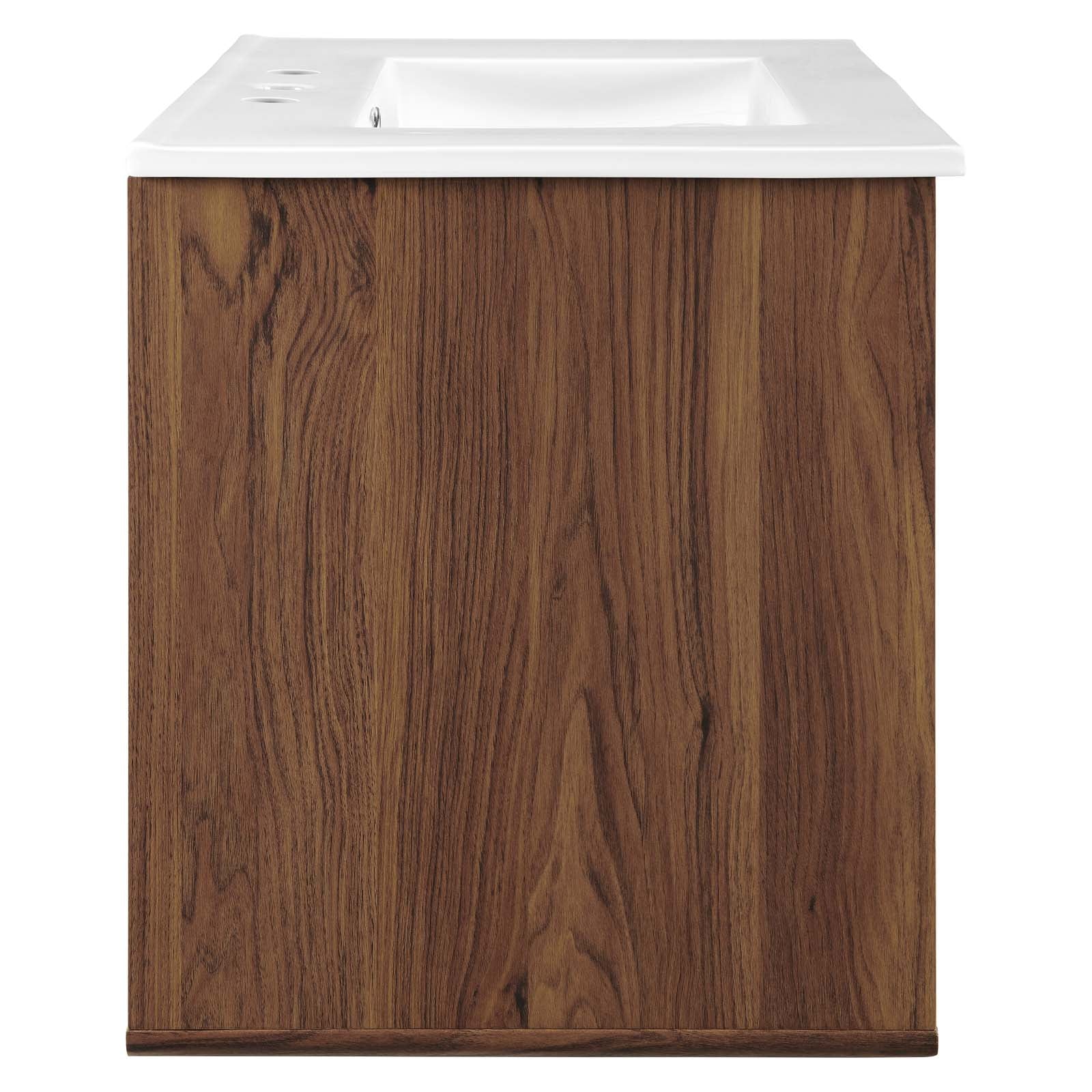 Bring mid-century modern aesthetics into the bathroom with the Transmit 30" Bathroom Vanity. This vanity features a durable particleboard and walnut grain veneer construction with ample storage space for all your bathroom essentials behind two white lacquered soft-close hinged doors. A ceramic sink with an integrated countertop, 8" centerset faucet holes, and rectangular sink basin continues the sleek look of this retro modern vanity. Complete with chrome knobs, this bathroom vanity mounts directly to the wall saving a substantial amount of floor space. Assembly required and sink fixtures not included. Set Includes: One - 30" Ceramic basin top One - 30" Vanity cabinet