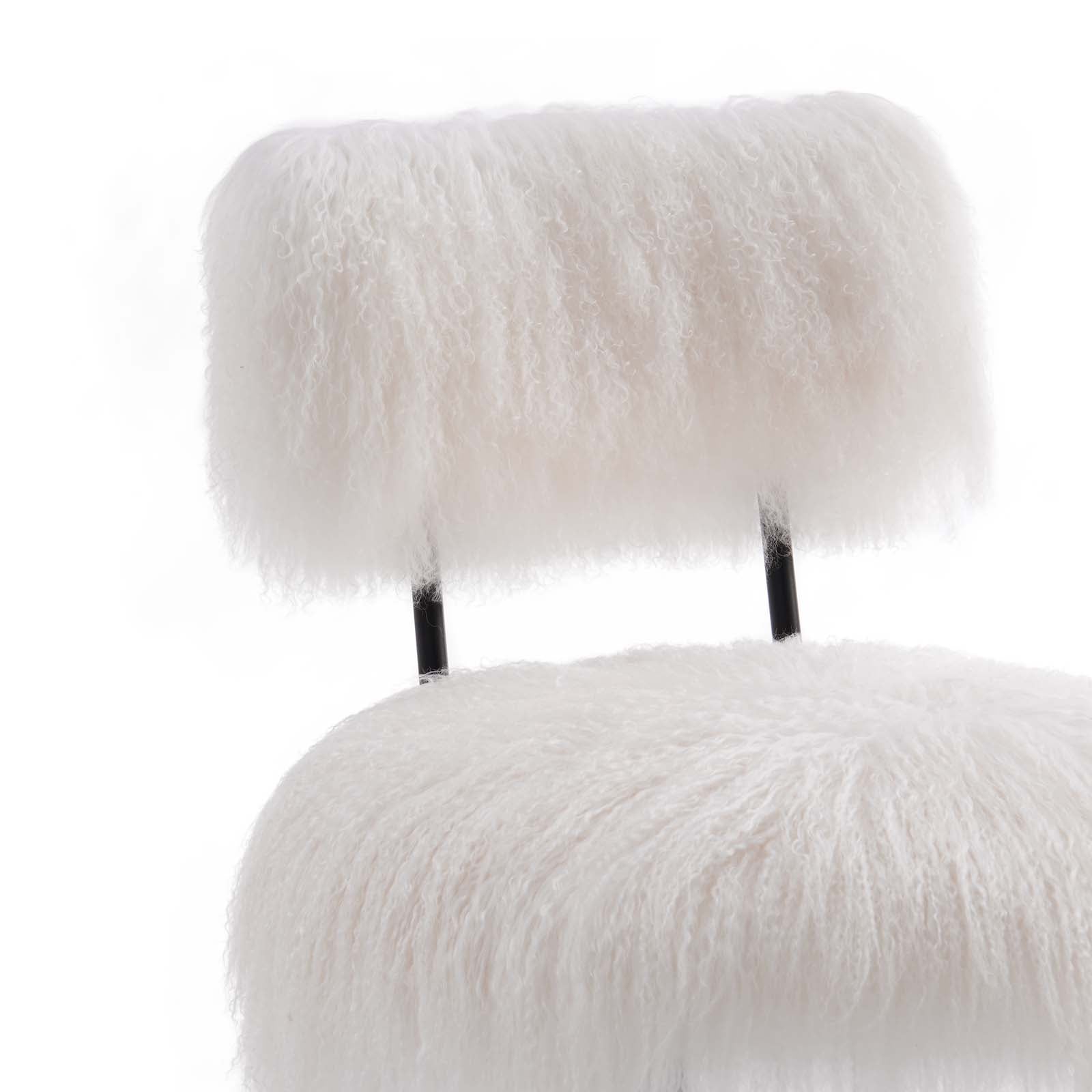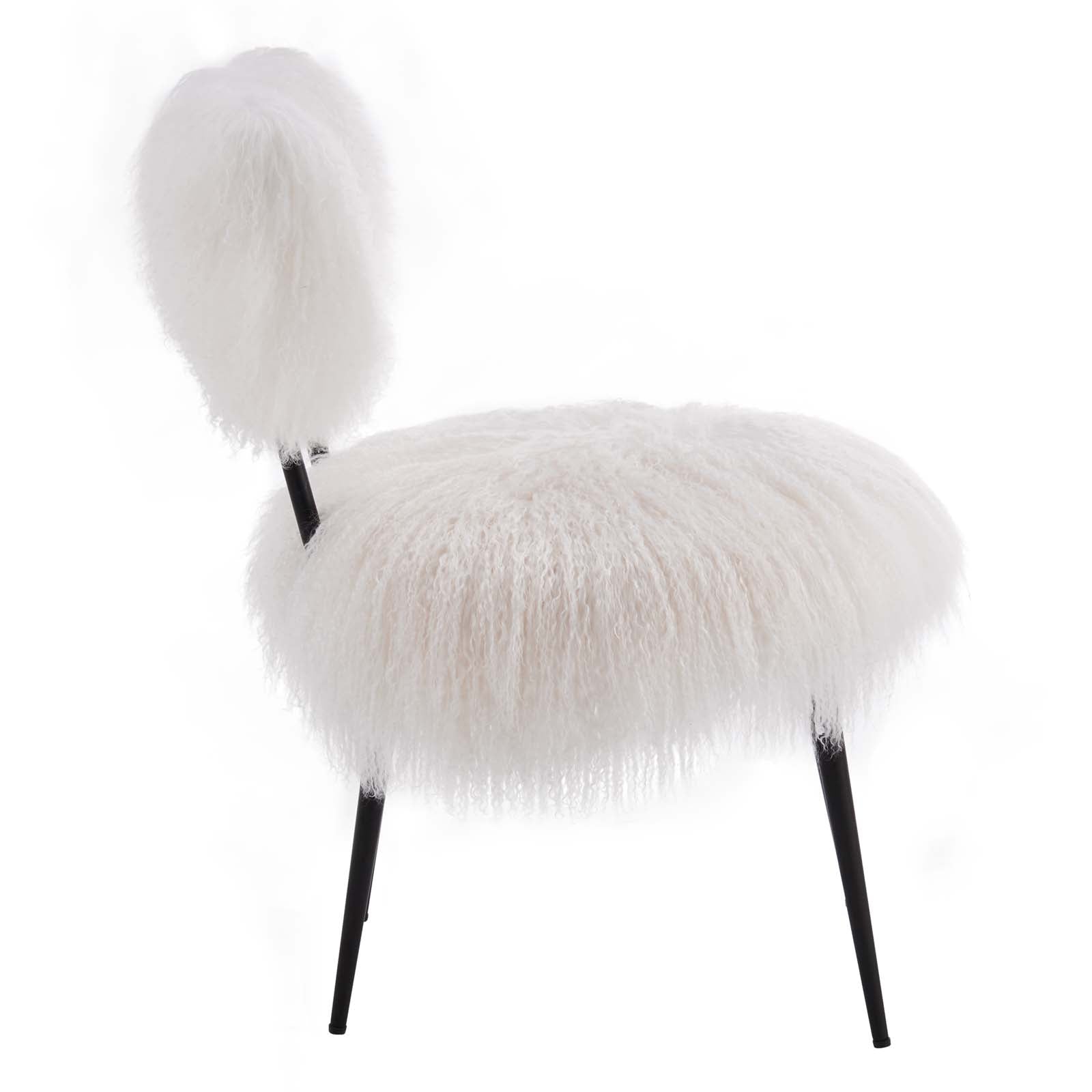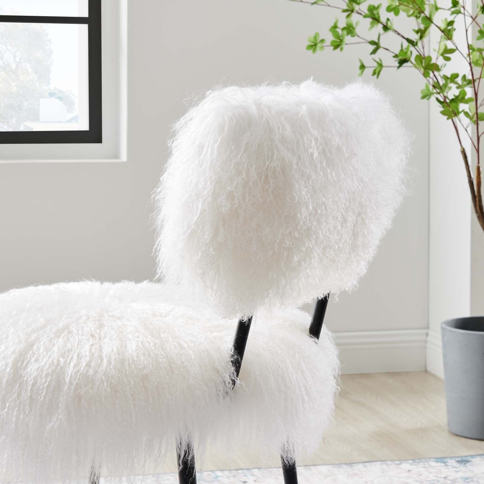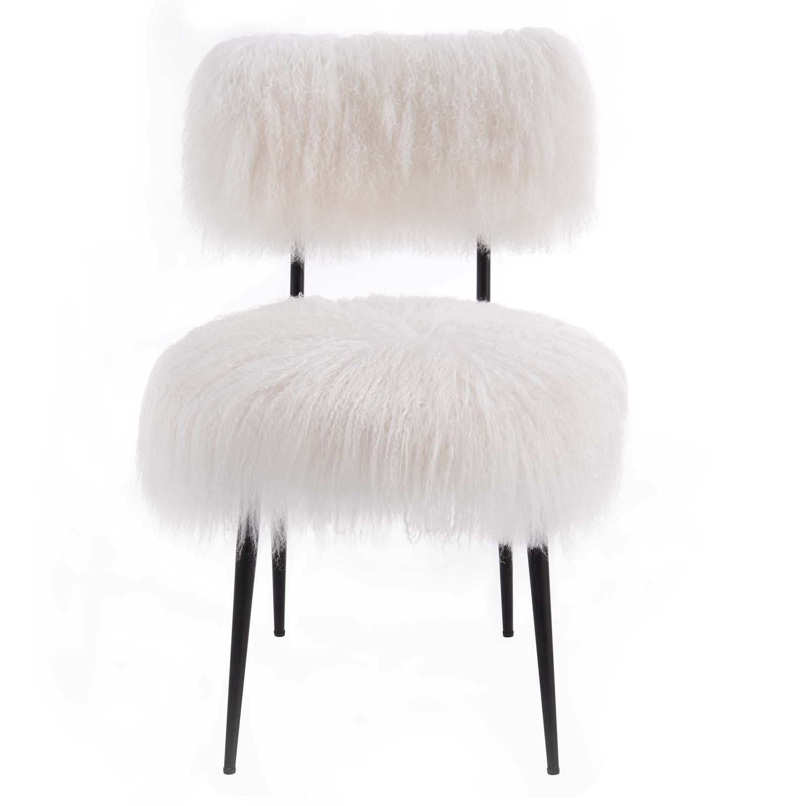 Animate your living spaces with the dynamism and style of the Skylar Sheepskin Chair, an exciting finishing touch in mid-century modern, bohemian, or eclectic settings. Dense foam padding and genuine sheepskin upholstery ensure a comfortable and luxurious seat at the dining table. This mid-century modern chair brims with an abundance of flair, a classic accent piece in living rooms and apartment spaces. Skylar delivers sophisticated comfort with panache in your living room or lounge spaces. This sheepskin accent chair rests on sturdy matte black metal legs, fitted with non-marking foot glides to protect your floors. Weight Capacity: 331 lbs. Set Includes: One - Skylar Chair