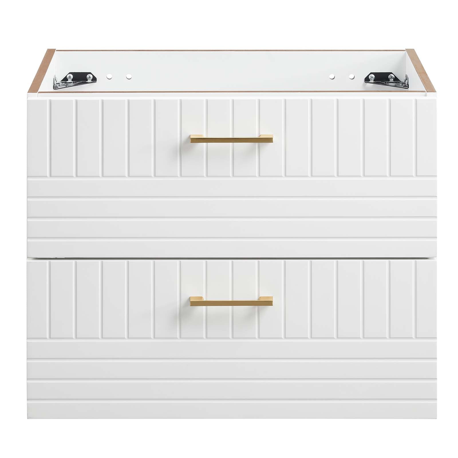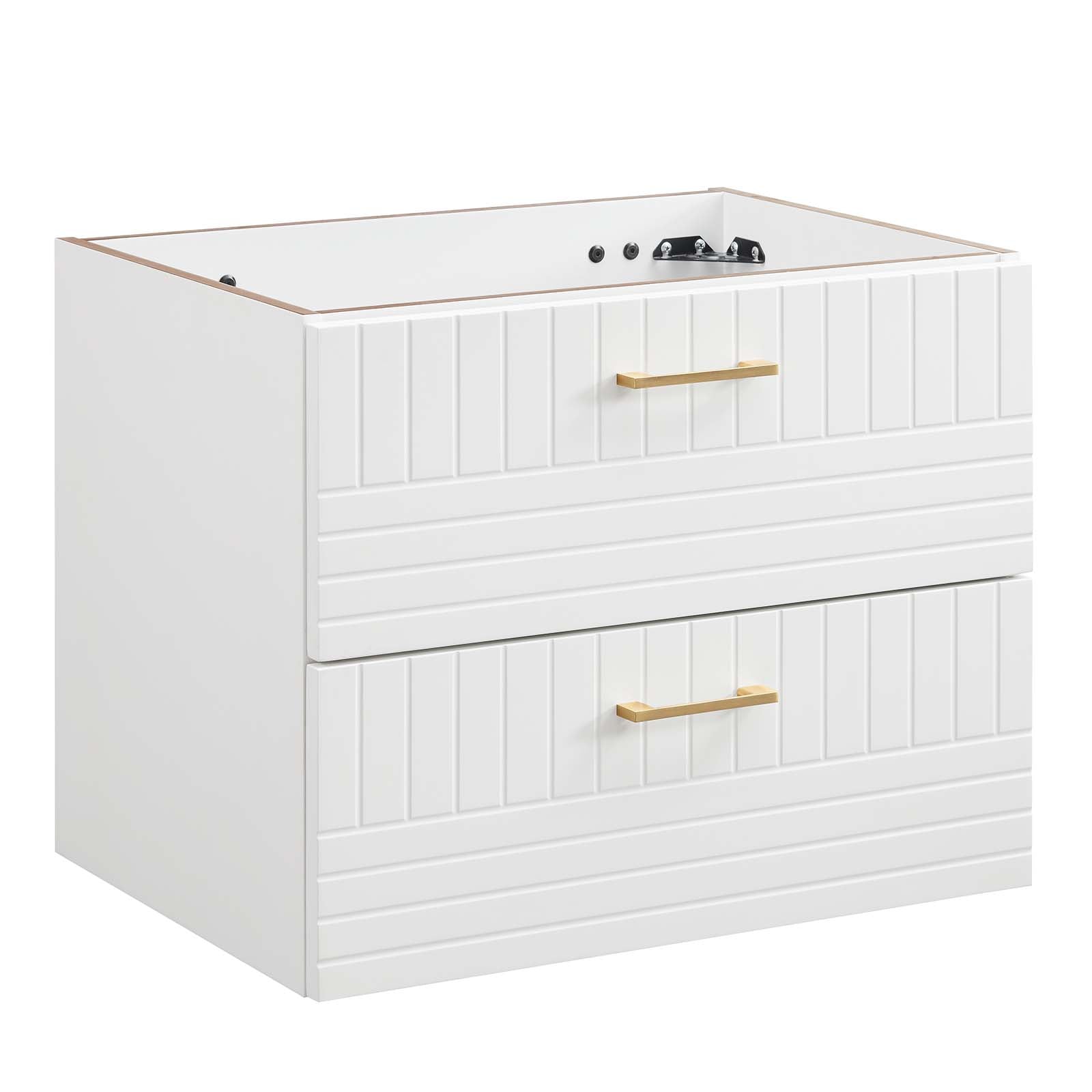 Refresh your bathroom space with the contemporary style of the Daybreak 24" Wall-Mount Bathroom Vanity. Featuring a modern silhouette, sophisticated matte finish, and brushed gold metal hardware, this vanity is durably crafted with a blend of rubberwood, MDF, and particleboard to create a lasting vanity for your bathroom. Mounting directly to your wall and saving substantial floor space, this bathroom vanity is complete with ample storage in its drawers to accommodate bathroom essentials and a cut-out design in the top drawer for plumbing. Assembly required. Sink basin and fixtures not included. Set Includes: One - Daybreak Daybreak Bathroom Vanity Cabinet (Sink Basin Not Included)