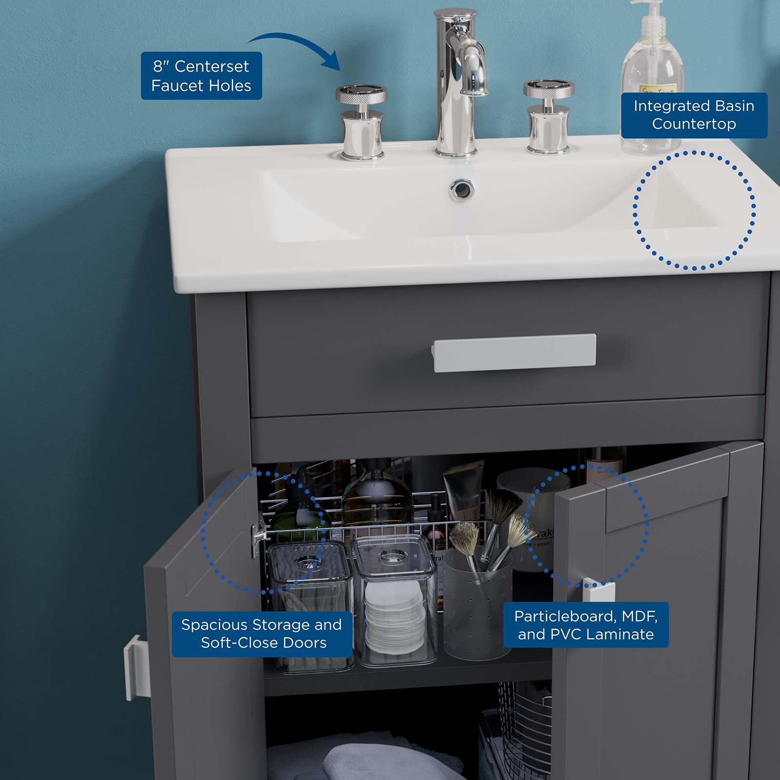 Incorporate refreshing style in the bathroom with the Laguna 24" Bathroom Vanity. Featuring crisp, clean lines and a streamlined design, this vanity is durably crafted with particleboard and MDF with PVC laminate and boasts a faux drawer front for added interest. Raised off the ground by simple legs, this bathroom vanity features spacious storage behind soft-close doors with an adjustable shelf to accommodate bathroom essentials. Featuring a ceramic sink basin with 8-inch centerset holes and an integrated countertop, this bathroom vanity aligns style with function for the modern bathroom. Laguna includes square handle pulls and non-marking foot caps to protect flooring. Assembly required, fixtures not included. Set Includes: One - Laguna 24" Bathroom Vanity