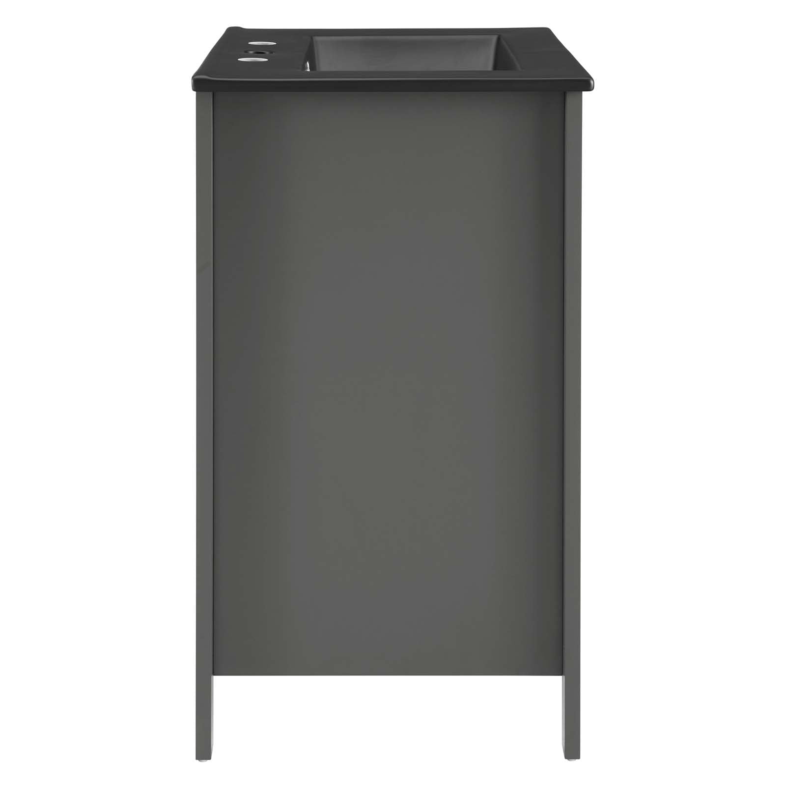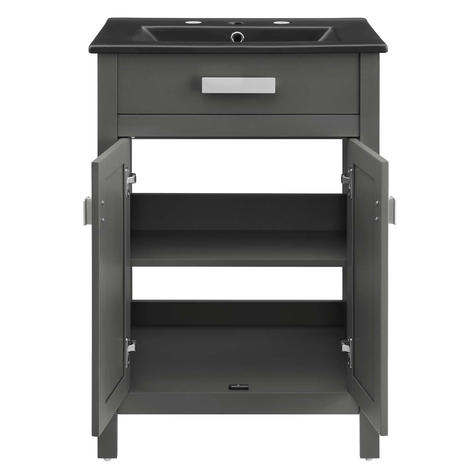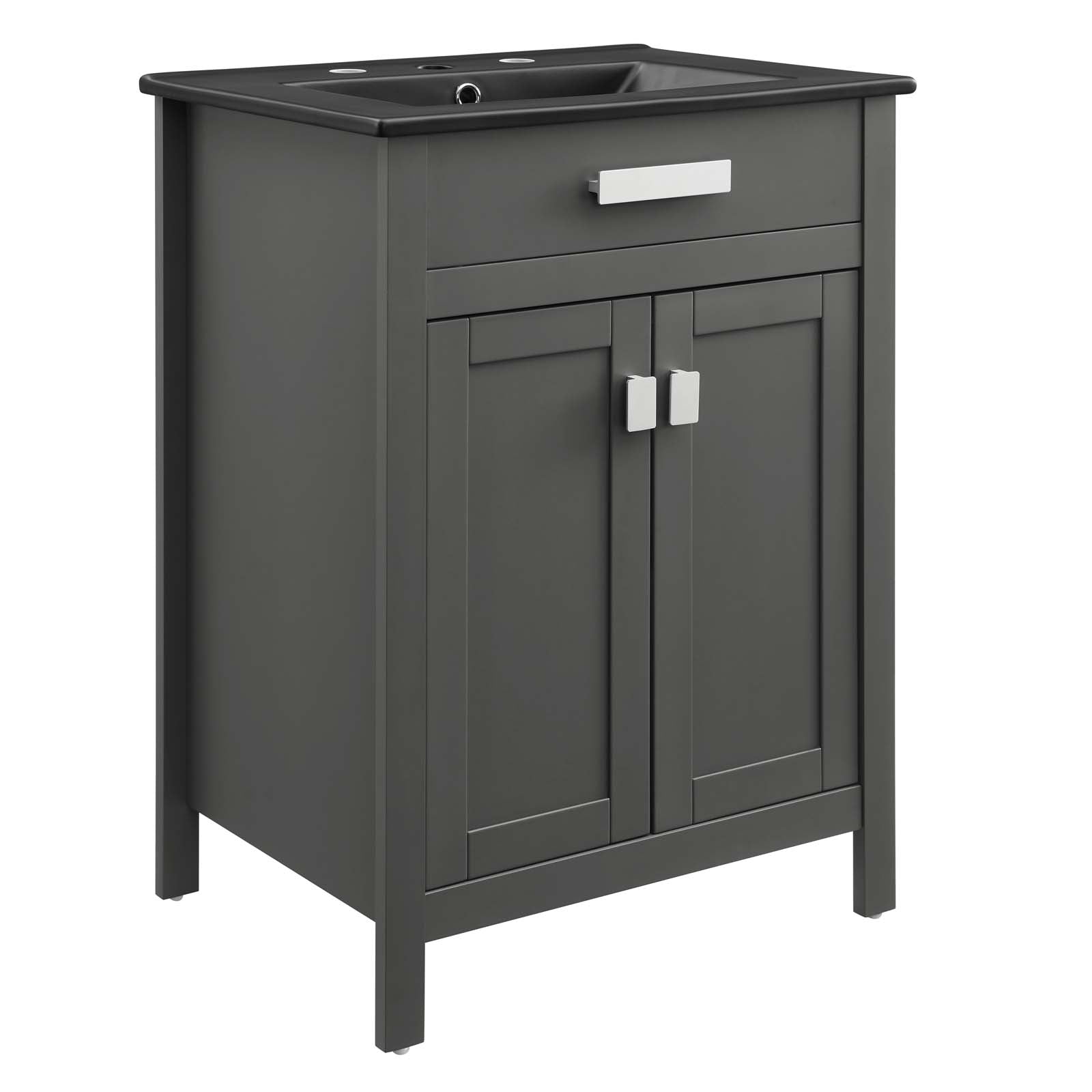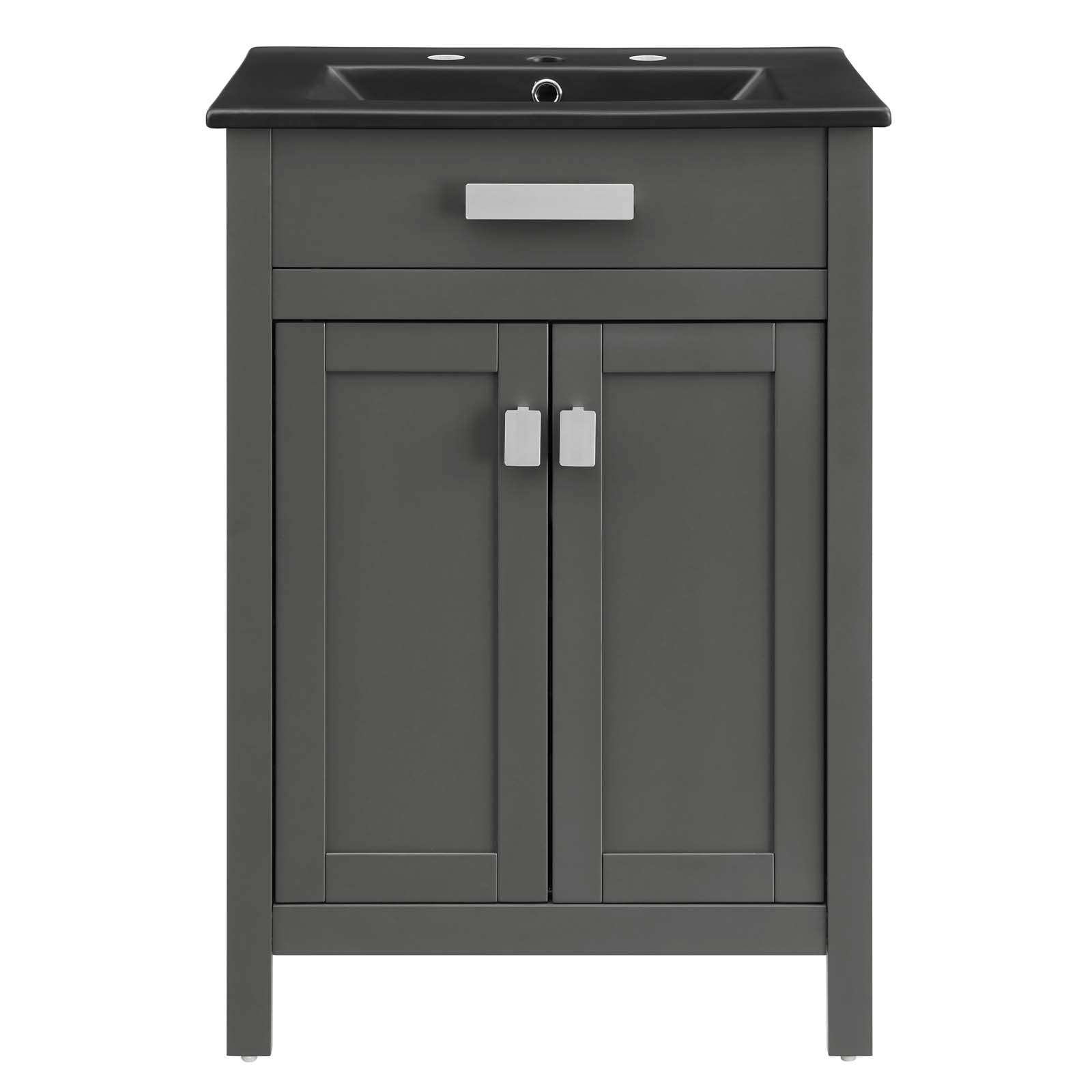 Incorporate refreshing style in the bathroom with the Laguna 24" Bathroom Vanity. Featuring crisp, clean lines and a streamlined design, this vanity is durably crafted with painted MDF and boasts a faux drawer front for added interest. Raised off the ground by simple legs, this bathroom vanity features spacious storage behind soft-close doors with an adjustable shelf to accommodate bathroom essentials. Featuring a ceramic sink basin with 8-inch centerset holes and an integrated countertop, this bathroom vanity aligns style with function for the modern bathroom. Laguna includes square handle pulls and non-marking foot caps to protect flooring. Assembly required, fixtures not included. Set Includes: One - 24" Ceramic basin top One - VANITY
