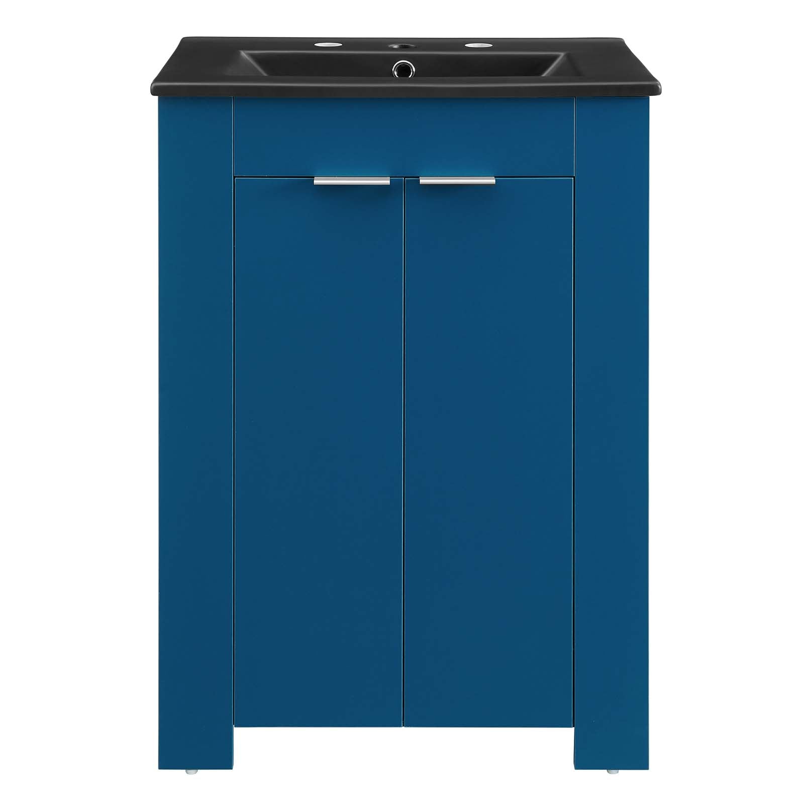 Incorporate modern aesthetics and contemporary style into your bathroom decor with the Maybelle 24" Bathroom Vanity. This vanity features a durable melamine construction with ample storage space for all your bathroom essentials behind two soft-close hinge doors with metal L-shaped handle pulls. Continuing the look of this modern vanity is a ceramic sink with an integrated countertop and 8" centerset faucet holes. A complete addition to the bathroom, this sink vanity rests on low-profile legs to slightly elevate it off the floor. Assembly required. Sink fixtures not included. Set Includes: One - 24" Ceramic basin top One - VANITY in Melamine lamination