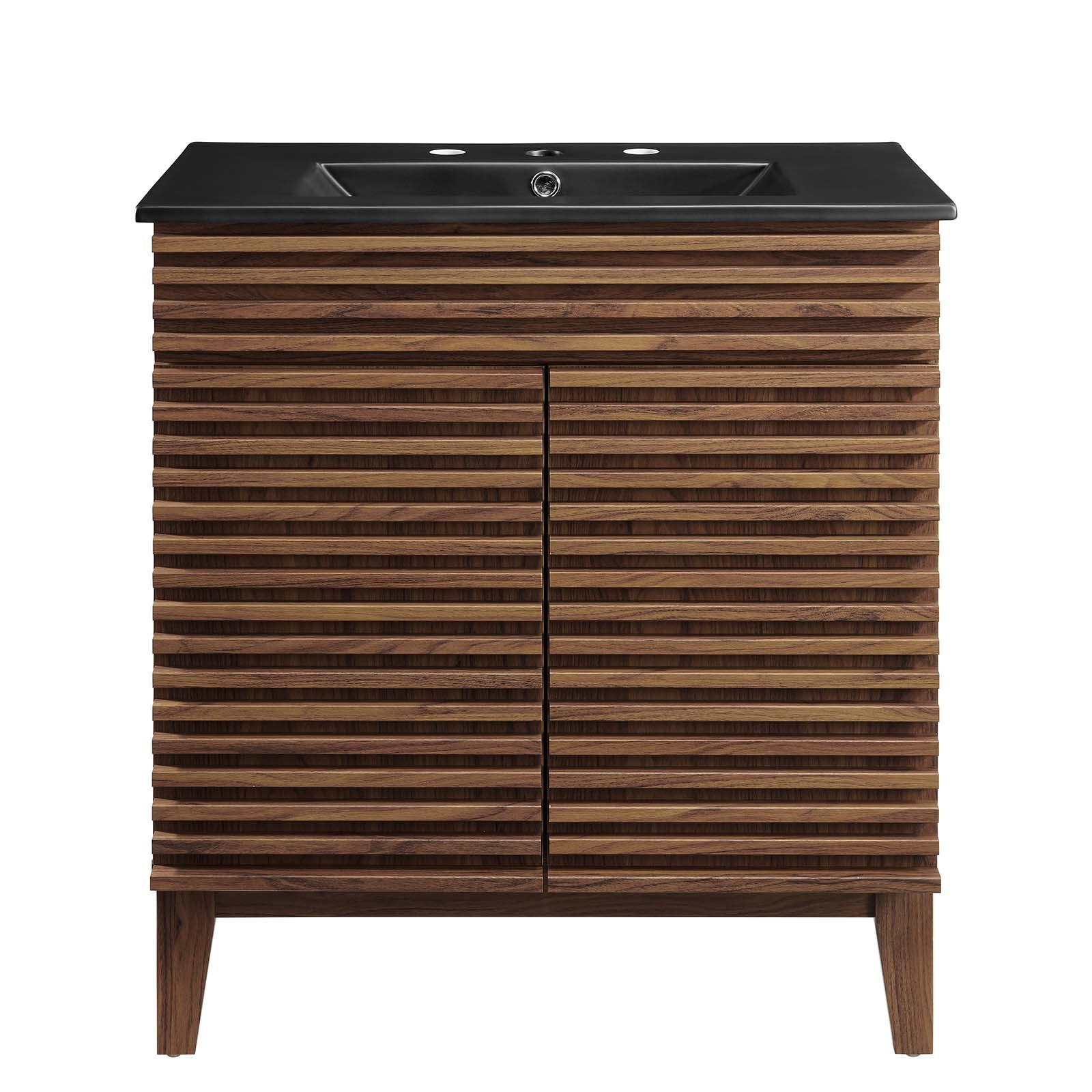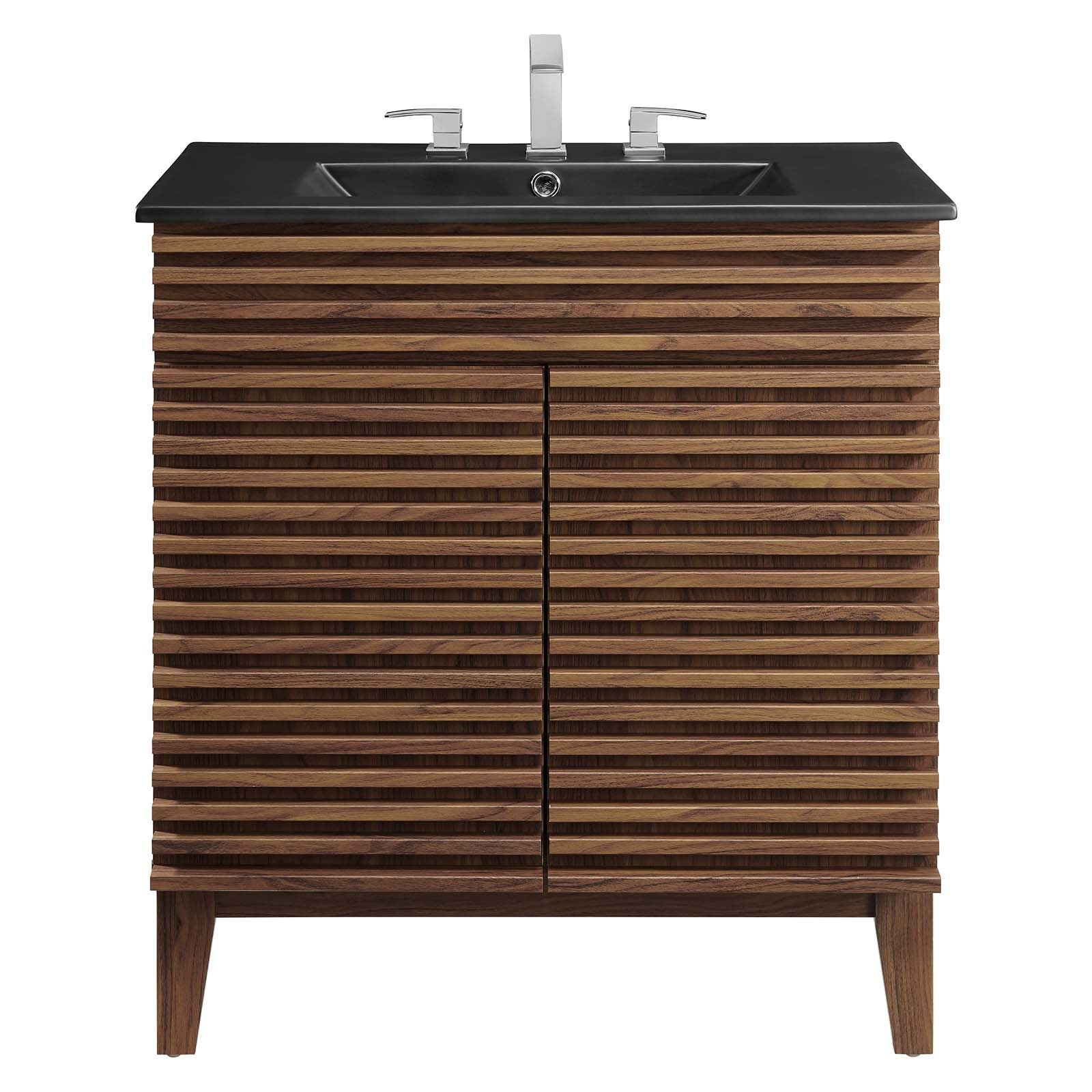 Tap into mid-century aesthetics with the Render Vanity. Render Bathroom Vanity features a durable particleboard frame with smooth laminate, four tapered wood legs, and adjustable storage shelf behind two soft-close hinged doors. A curved ceramic basin and integrated countertop with three faucet holes create sleek lines and crisp design for an edgy style designed to meet your needs. Boasting a mid-century modern style this vanity features a solid construction with a pleasing look and practical functionality. 8" centerset faucet holes. Assembly required and fixtures not included. Set Includes: One - 30" Ceramic basin top One - 30" Vanity cabinet