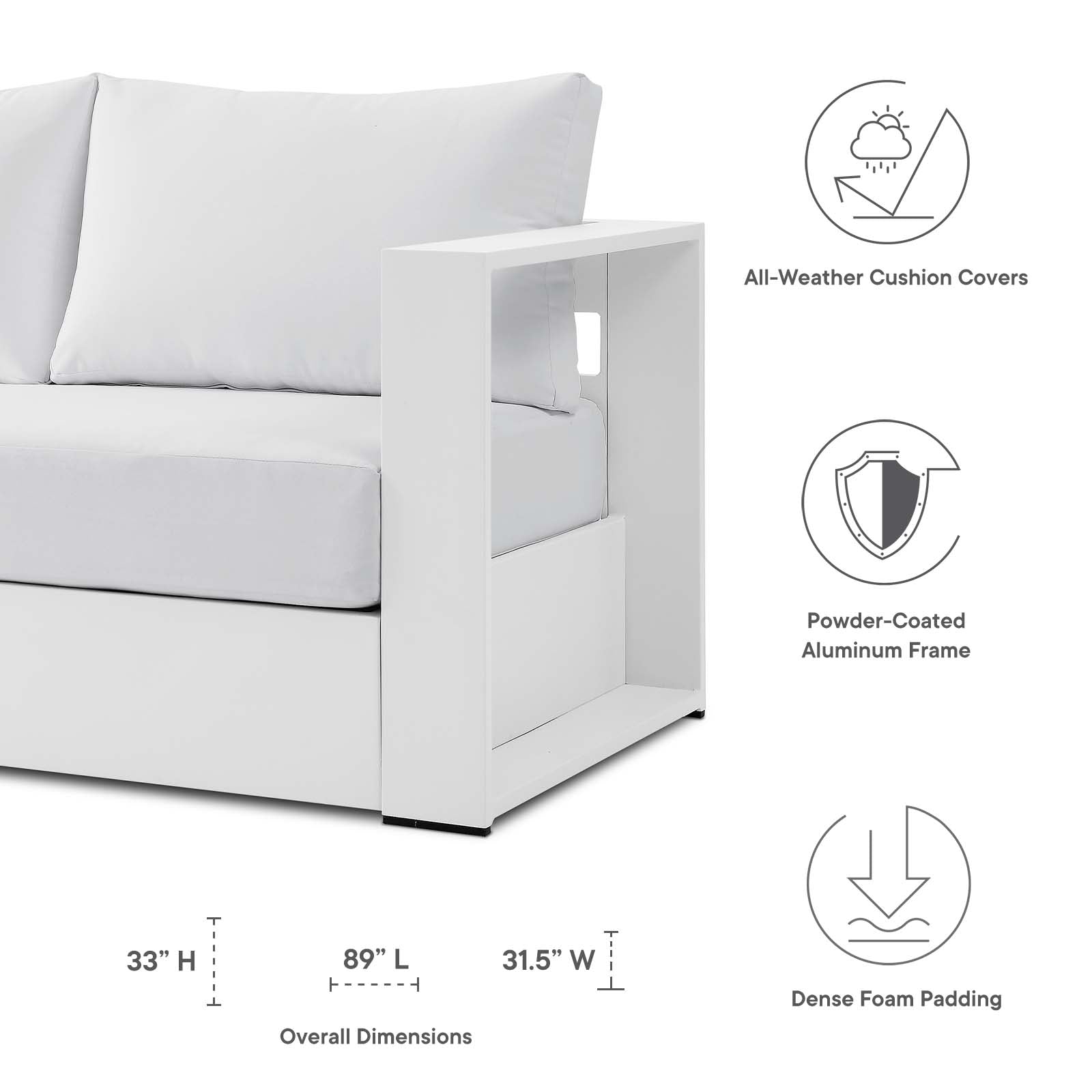 • Bullets: Outdoor Patio Sofa Powder-Coated Aluminum Frame Dense Foam Padding Weather-Resistant Fabric Stain-Resistant Fabric Non-Marking Foot Glides Assembly Required