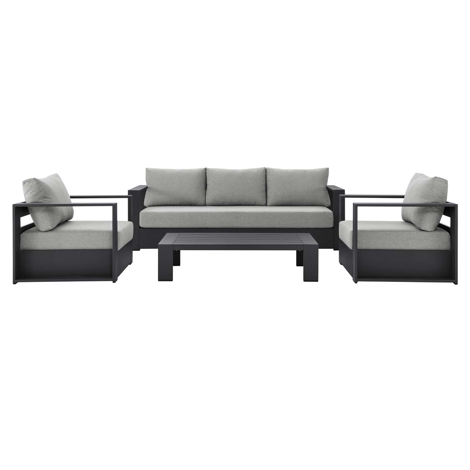 Enliven your alfresco spaces with the Tahoe Aluminum 4-Piece Outdoor Patio Set. This modern outdoor patio set includes two armchairs, a sofa, and a coffee table, crafted with durable powder-coated aluminum, dispensing contemporary elegance in your outdoor lounge spaces. The Tahoe 4-Piece Patio Set is perfect for poolside lounging with a sunproof, water-resistant fabric-covered seat and backrest. With dense foam padding for sustaining comfort and removable, stain-resistant cushions on the sofa and armchairs, this patio set is low maintenance and high performing. A durable patio set, Tahoe comes with easy-to-follow assembly instructions and features non-marking foot glides to protect your deck or patio floor. Weight Capacity - Chair: 331 lbs. Sofa: 993 lbs. Set Includes: One - Tahoe Powder Coffe Table One - Tahoe Powder Sofa Two - Tahoe Powder Armchair