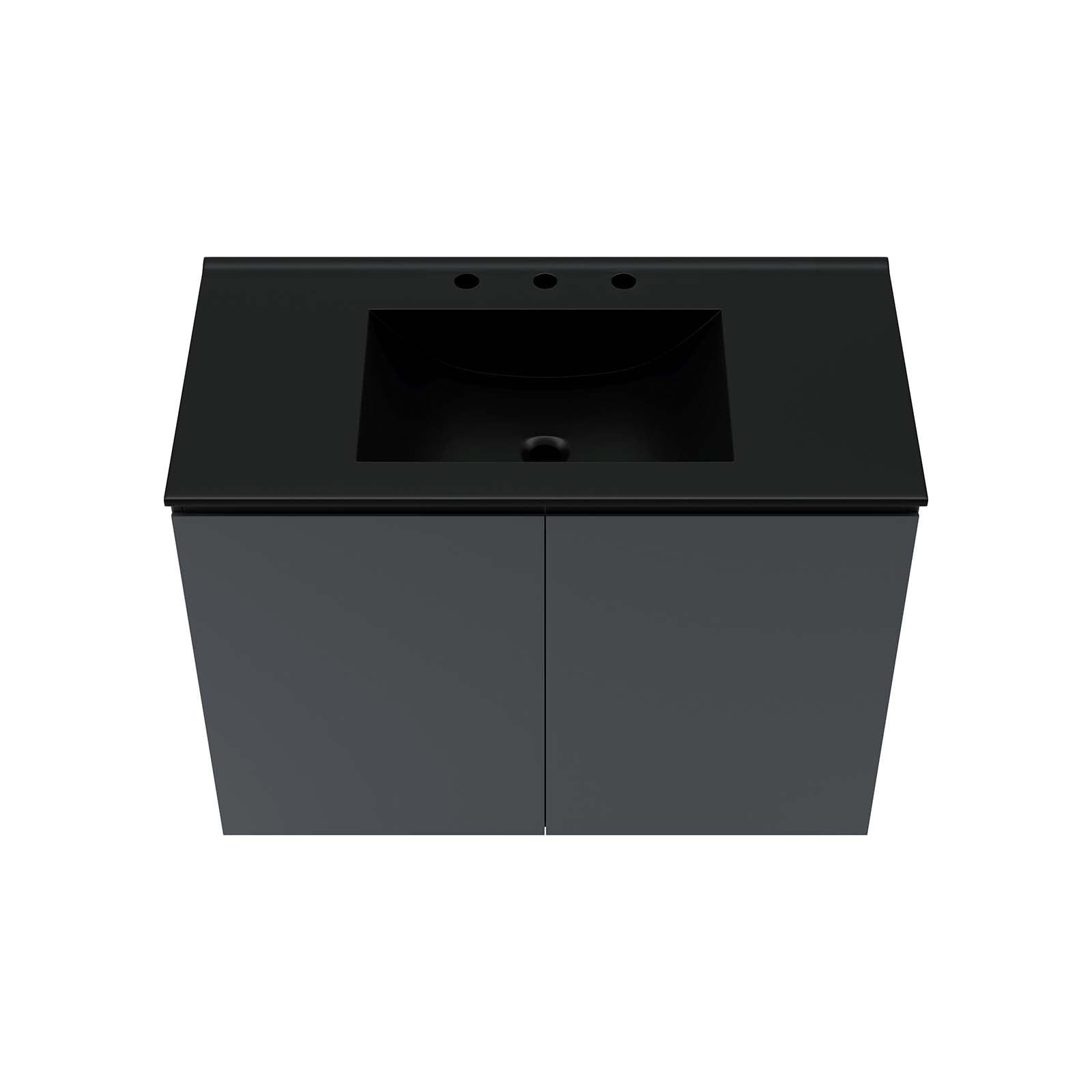 • Bullets: Modern Bathroom Vanity Soft-Close Doors Melamine and Particleboard Construction Wall-Mount Design Ceramic Sink With Integrated Countertop 8" Centerset Faucet Holes Assembly Required