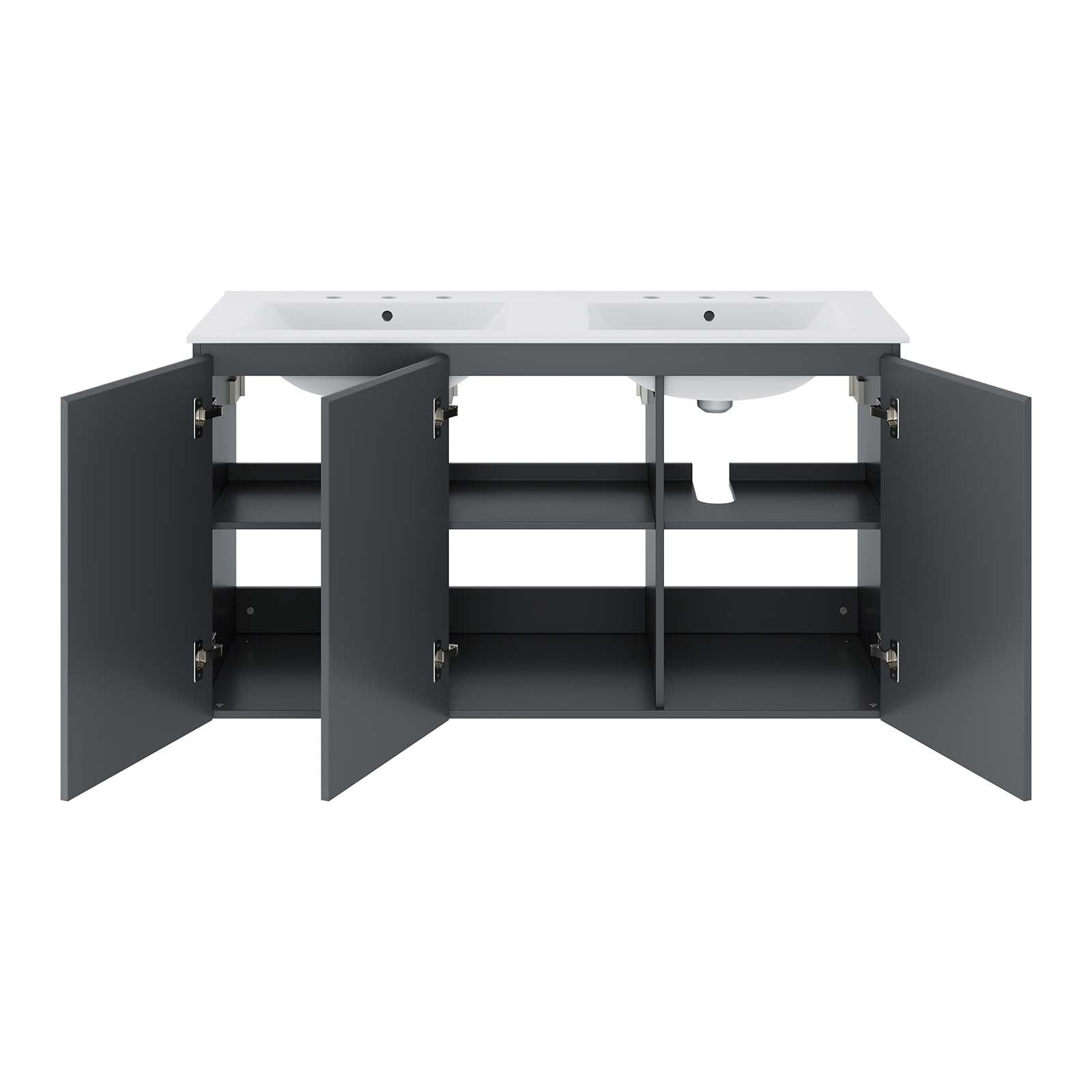 The sleek look and clean-lined silhouette of the Bryn 48" Wall-Mount Double Sink Bathroom Vanity add modern style to your bathroom space. Durably crafted with particleboard and melamine, this vanity mounts directly to the wall and features ample storage space under the sink behind three soft-close doors. Bryn features a cut-out design to accommodate plumbing. This vanity is complete with a double sink ceramic basin with 8-inch centerset holes and an integrated countertop. Fixtures not included. Assembly required. Set Includes: One - Bryn 48" Wall-Mount Double Sink Bathroom Vanity