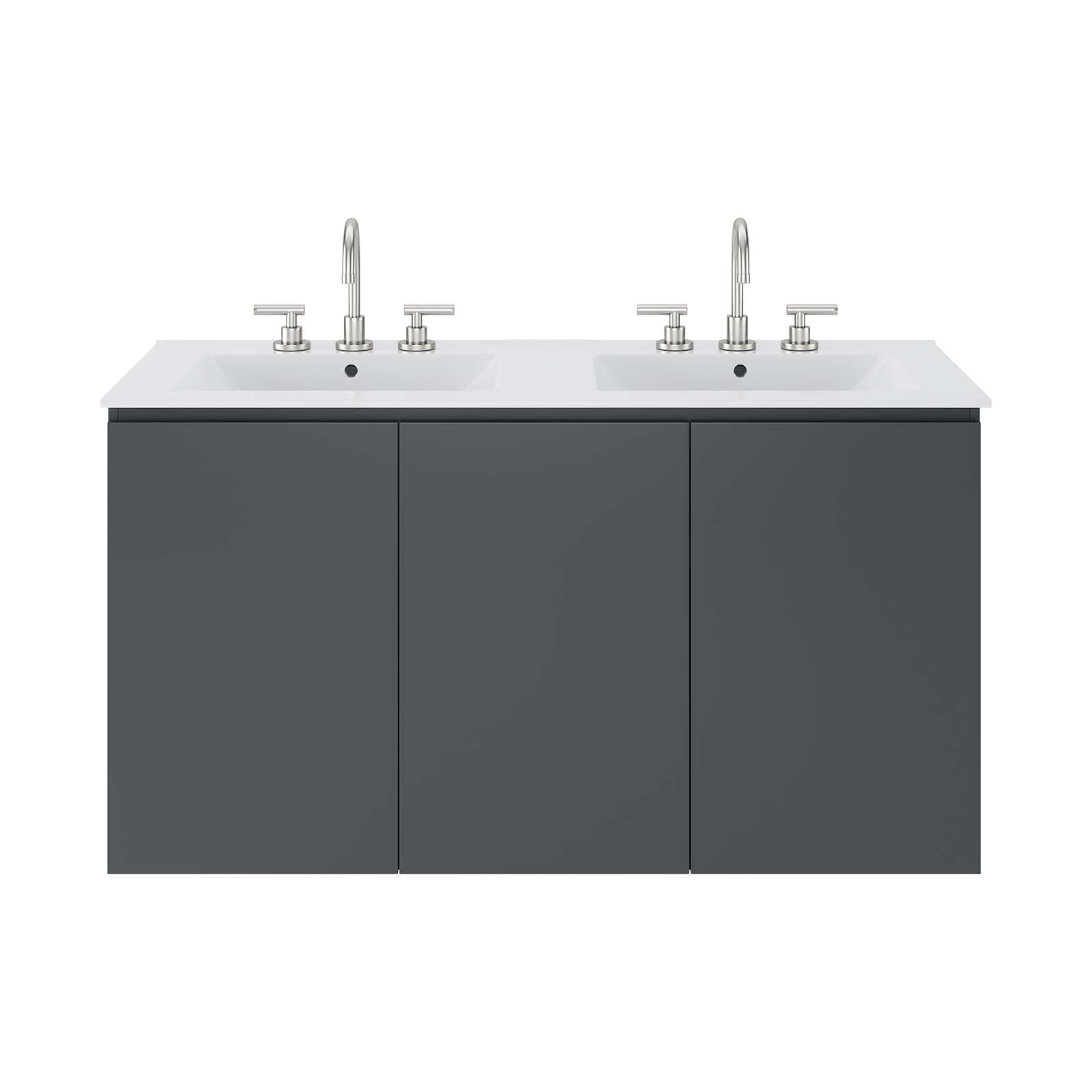 • Bullets: Modern Bathroom Vanity Soft-Close Doors Melamine and Particleboard Construction Wall-Mount Design Ceramic Double Sink With Integrated Countertop 8" Centerset Faucet Holes Assembly Required