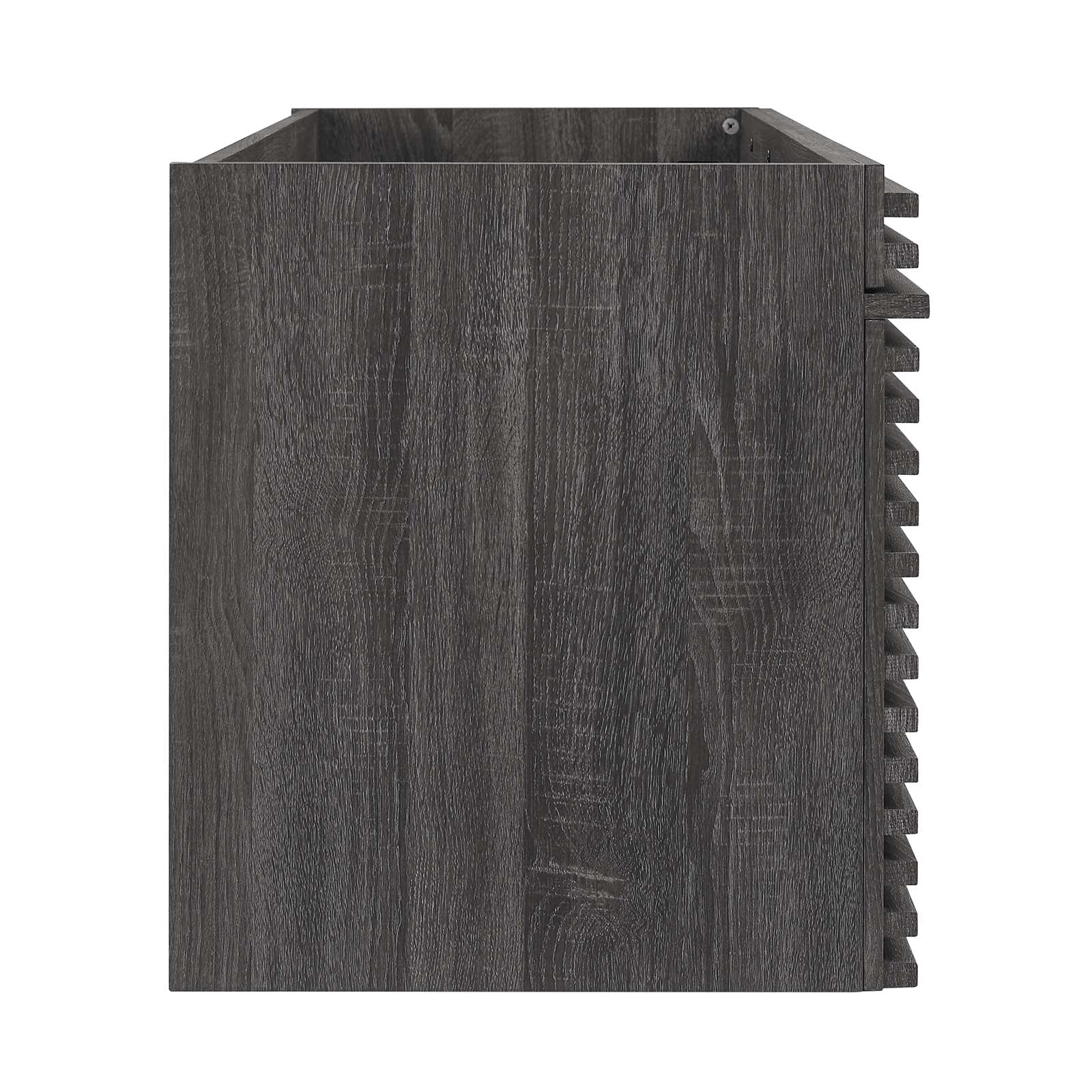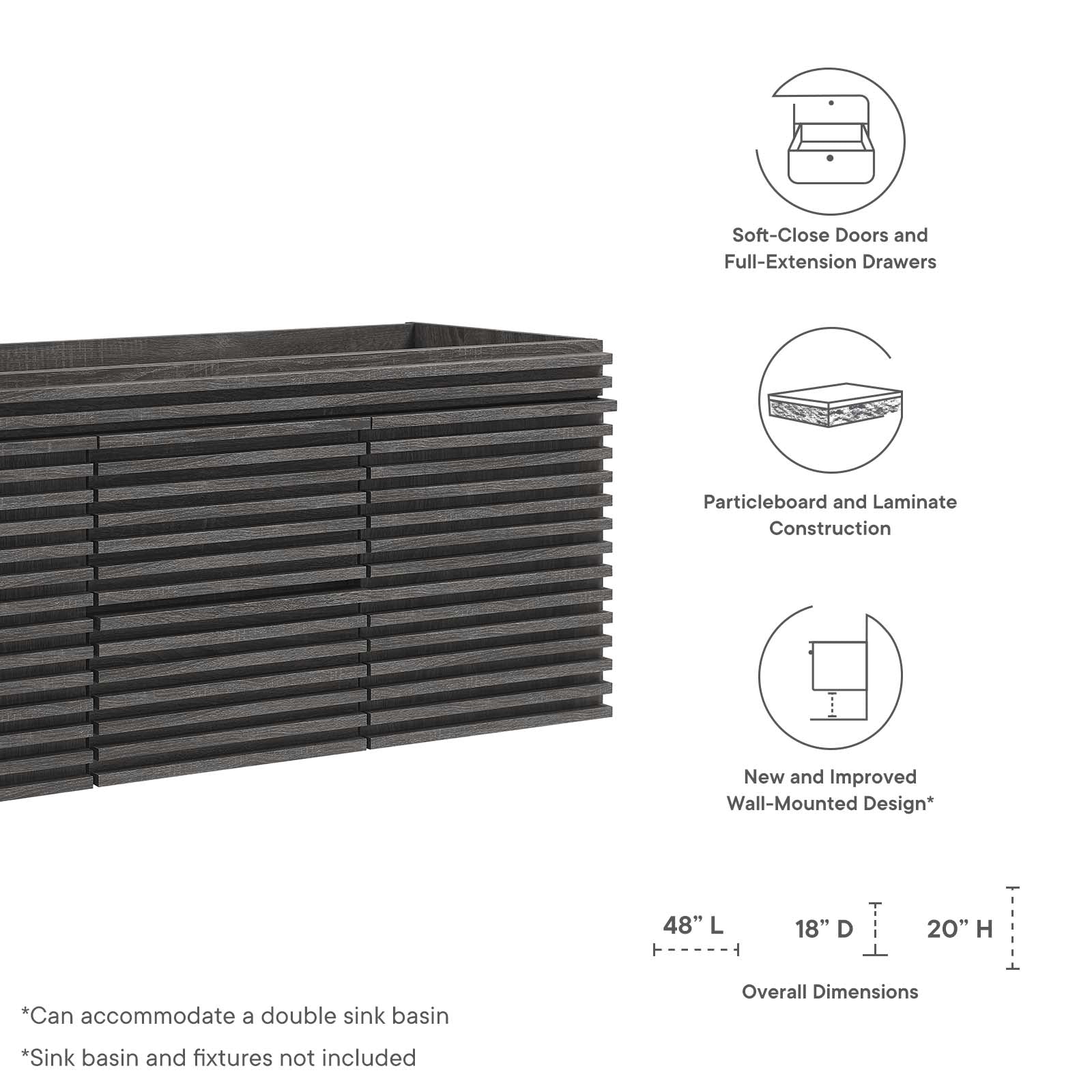 • Bullets: Mid-Century Modern Vanity Drywall Friendly Mounting Cleat MDF and Particleboard Full-Extension Drawers Sink Basin Not Included Fixtures Not Included