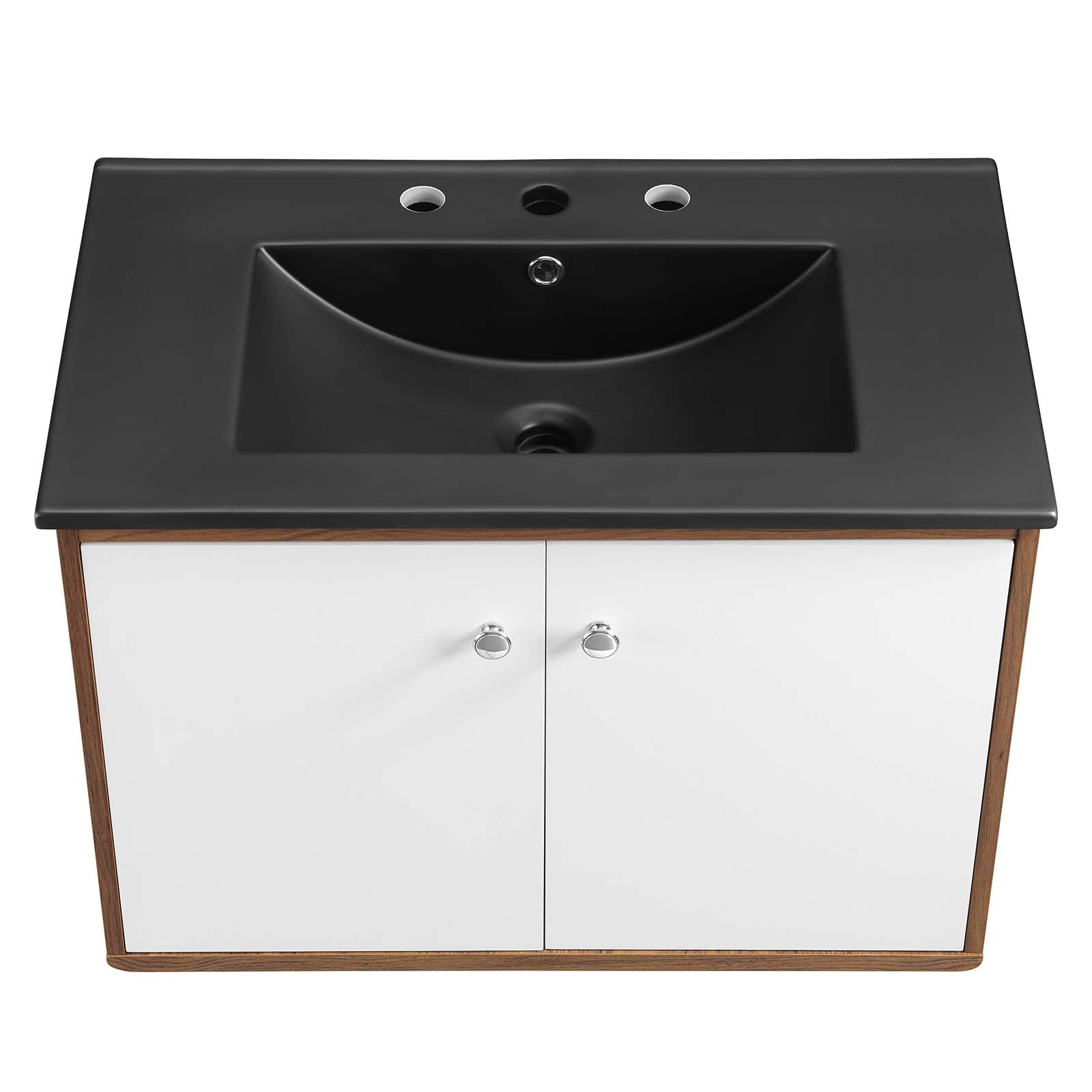 Bring mid-century modern aesthetics into the bathroom with the Transmit 30" Bathroom Vanity. This vanity features a durable particleboard and walnut grain veneer construction with ample storage space for all your bathroom essentials behind two white lacquered soft-close hinged doors. A ceramic sink with an integrated countertop, 8" centerset faucet holes, and rectangular sink basin continues the sleek look of this retro modern vanity. Complete with chrome knobs, this bathroom vanity mounts directly to the wall saving a substantial amount of floor space. Assembly required and sink fixtures not included. Set Includes: One - 30" Ceramic basin top One - 30" Wall standing Vanity cabinet