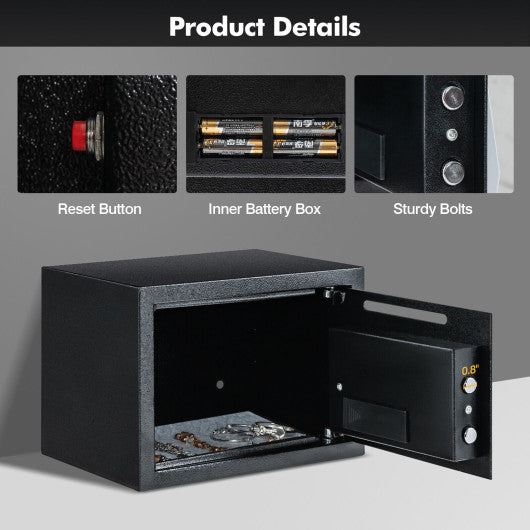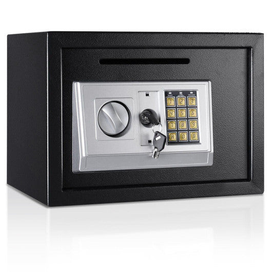 The digital safe box is a great security room for quick depository such as cash paper work or employee turnover.   The electronic lock can easily be programmed by the user with a "safety key" override. The code consists of 3-8 programmed pin digits and keyless design is safe and convenient to you. The magnetic lock is designed for auto-locking the safe without any keys or pin code. The safe is set with a time out period after 3 incorrect combination attempts.   The safe has pre-drilled holes behind it with included 2" for anchoring to the floor wall or cabinet. Don’t hesitate to buy home.   Opens with digital pin or included override key Hidden lock with one key Security code from 3-8 digits using any number from 0-9 Time out period after 3 incorrect combination attempts Constructed with 2 mm thick solid steel 4 mm thick front door for more security Pre-drilled holes behind the safe with included 2" bolts for anchoring Inside tamper-proof hinges Carpet padding on inside bottom Mounting to the floor wall or cabinet
