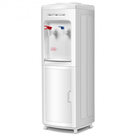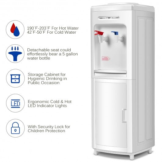 Not Available For Sale Or Use in CaliforniaThis top-loading water dispenser features excellent exterior design and attractive white finish that will blend well with your room decor. This electric water dispenser is sturdy and durable because of the premium construction of ABS and PP materials. It features a low noise compressor cooler and high-efficiency design which is ideal for home office or other public places. The child safety lock provides protection against burns and LED indicator lights to make you clear about the operation status. It is compatible with 2 to 5 gallons of large-capacity water bottles for wide application. Do not hesitate to buy one! With a security lock on the hot water tap to prevent from accidental burns Two switches at the back the red for heating and the green for cooling LED indicator lights make you clear about the operation status The water barrel seat and the drip tray are detachable for easy cleanup Designed with a large storage cabinet to place disposable plastic cups Perfect for home office and public places like a library and restaurant etc. Mainly crafted by premium durable ABS and PP plastic sturdy and durable With a good bearing capacity to holds up to a 5-gallon water bottle The drip tray avoids water spills and anti-dust mite water barrel seat ensures the hygienic drinking water
