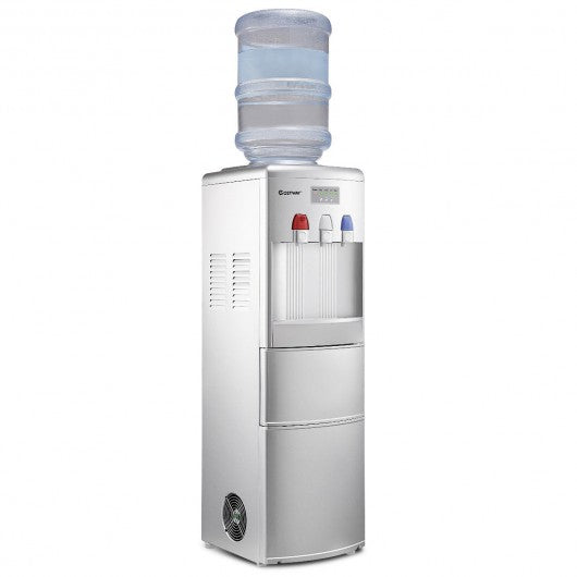 This multi-function water dispenser with built-in ice maker brings the convenience of a refreshing water dispenser and a filtered ice maker together into a single elegant and economical appliance. It features a tri-temp push button faucet making it easy to dispense cold hot and room-temperature water. The user-friendly control panel and led indicator make it easy to operate. The built-in ice maker can make 9 bullet ice cubes as little as 7 minutes. Led indicators make it easy to see whether the water dispenser is on or off and whether it's heating cooling or making ice. It fits in almost any space and provide your room with a stylish accent. Don't you want such a functional water dispenser? Just buy it! Classic appearance in your home office or any public space User-friendly control panel to start making ice hot or cold water Equipped with a child safety lock on the hot water spout Built-in ice maker is able to make up to 27lbs per day Can make 9 bullet ice cubes at a time in 6-14 minutes Anti-rust drip tray is easy to clean