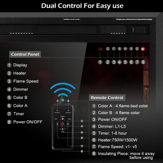 This is the high-quality embedded fireplace which is quite ideal for your home or office. It not only better warms your room up in cold weather featuring realistic flame present but a modern and attractive decoration to your home and office without any air pollution or energy waste. It aims to offer you a green and efficient life style. You can set your flame speed fix your time or change to your favored color from distance with a remote control to meet your various demands. You will surely be surprised by this high quality fireplace insert which brings you not only good functional performance but beauty satisfaction. This is the embedded fireplace. Please do not hesitate to add it to your cart now! Efficient and space-saving A perfect decoration to your house Insert design maximizes the space usage 4 Flame color and 4 flame bed color options 5 Modes for adjusting the brightness and speed of the flame Realistic flame present 1-8 Hour customized time setting Double control available Full function remote control