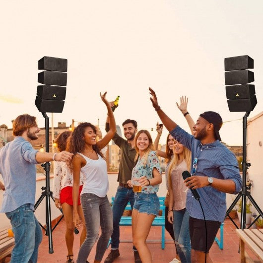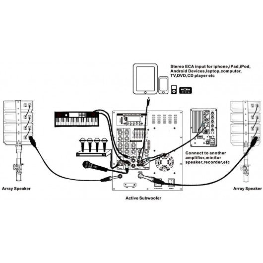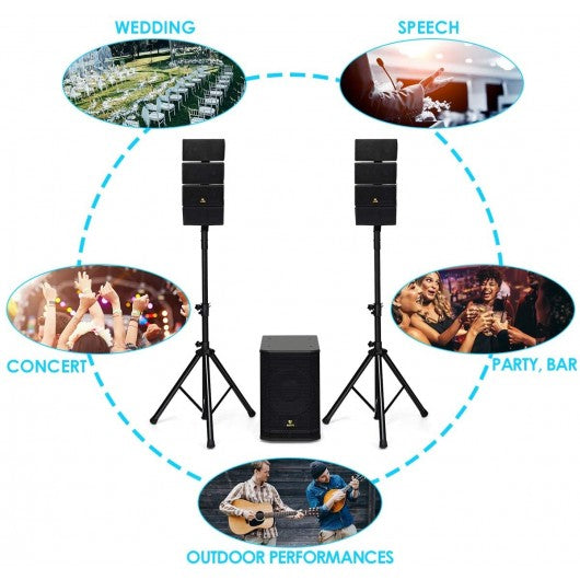 Speaker System Array Set include one active subwoofer one passive subwoofer 8 x 4" array speakers 2 adjustable speaker stands one 16.7-feet speaker line 6 x 14" speakon cables one 8-feet 6.35mm+ speakon cables one 20-feet 6.35mm+speaker cables one remote control. The 12"active bass reflex subwoofer has a built-in amplifier to magnify the audio signal and then streams the music to audiences. With wide frequency range from 35Hz to 20KHZ this array speaker set is suitable to amplifyany type of audio and bring professional sound quality experience with a true stereo and full-range of sound.With 650W RMS power and 3000W peak power the PA system speaker set is suitable for large performance which can accommodate nearly a thousand people and also awesome for house parties smaller venue gigs birthday party reception country gigs wedding gymnastics and etc. If you are looking for such product don't hesitate to place an order! XLR/6.35mm/RCA Built in Bluetooth Clear and Deep Stereo Sound USB Flash & SD Memory Card Readers Wireless remote control for easily control Large LCD display to clearly indicate the current mode Built-in handles on the side easily to lift and transport the subwoofers Telescoping speaker poles make the overall height adjustable from 68 inch to 86 inch to ensure good acoustics