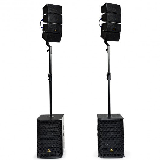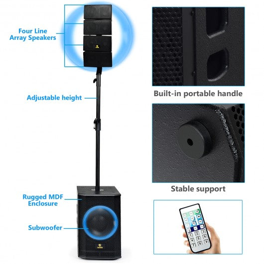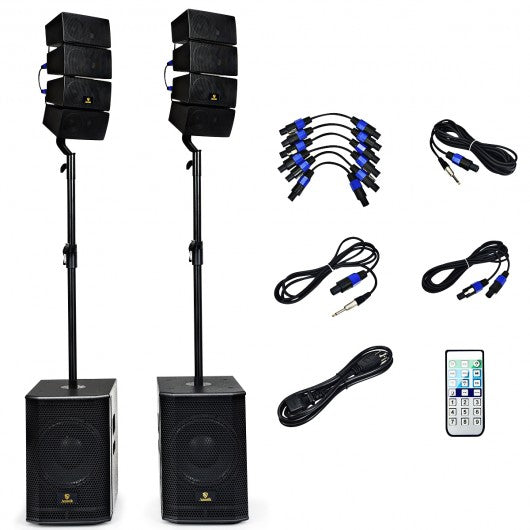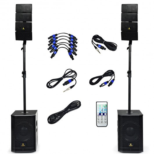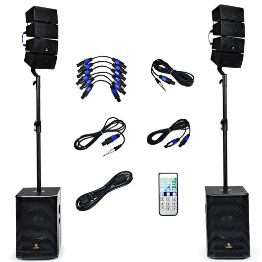 Speaker System Array Set include one active subwoofer one passive subwoofer 8 x 4" array speakers 2 adjustable speaker stands one 16.7-feet speaker line 6 x 14" speakon cables one 8-feet 6.35mm+ speakon cables one 20-feet 6.35mm+speaker cables one remote control. The 12"active bass reflex subwoofer has a built-in amplifier to magnify the audio signal and then streams the music to audiences. With wide frequency range from 35Hz to 20KHZ this array speaker set is suitable to amplifyany type of audio and bring professional sound quality experience with a true stereo and full-range of sound.With 1000W RMS power and 4000W peak power the PA system speaker set is suitable for large performance which can accommodate nearly a thousand people and also awesome for house parties smaller venue gigs birthday party reception country gigs wedding gymnastics and etc. If you are looking for such product don't hesitate to place an order! XLR/6.35mm/RCA Built in Bluetooth Clear and Deep Stereo Sound USB Flash & SD Memory Card Readers Wireless remote control for easily control Large LCD display to clearly indicate the current mode Built-in handles on the side easily to lift and transport the subwoofers Telescoping speaker poles make the overall height adjustable from 68 inch to 86 inch to ensure good acoustics