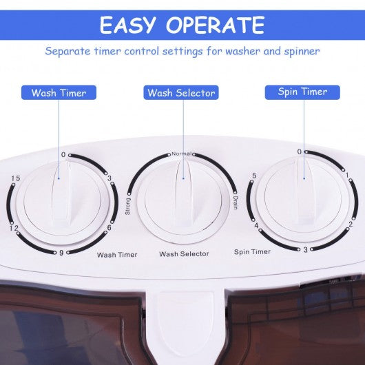 Specification: Color: White and blue Material: Propane polymer Product size: 22.6" x 14.0" x 22.2" (L x W x H) Power supply: 110V/60 Hz Rated washing capacity: 8 lbs Washing power: 70 W Rated spin capacity: 6.6 lbs Spinner power: 25 W Spin speed: 1350 rpm Length of inlet pipe: 34.1" Length of drain pipe: 18.3" Length of cable: 5.0 ft Package include: 1 x Double bin washing machine