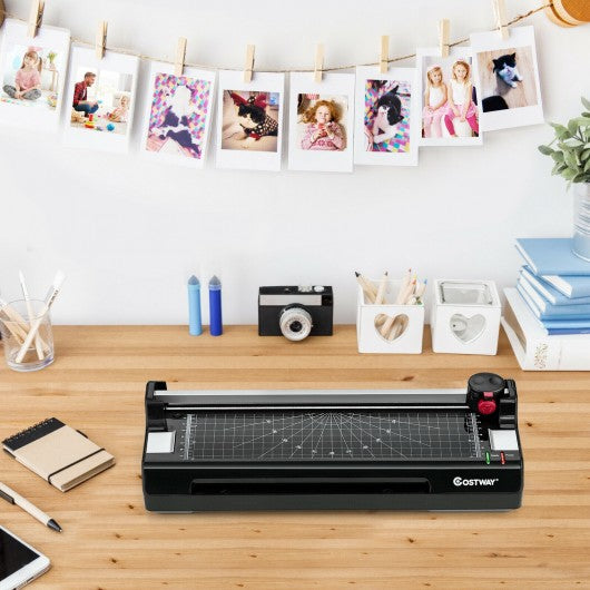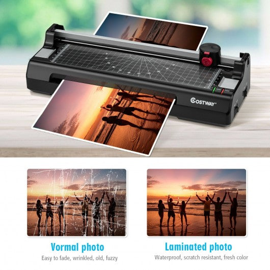 This laminator machine can help you to keep your pictures and document safe and clean! It only takes 3-5 minutes to preheat with laminating speed about 250mm/min. Various sized paper (maximum A4 paper) can be well laminated through this machine. With upgraded heating system the laminating process would be more safety to protect your machine and make it last longer year. Hot and cold lamination is alternative for different needs to make it easier and more perfect in thermal lamination. If it occurred jams accidentally you can press the pouch release button to solve it. It won't damage your machine. Equipped with 3 in 1 paper trimmer It can cut three different patterns straight perforated and waved. You can choose one of your favorite patterns to cut the pouches. The built in corner rounder which better protect your and your child's skin from being cut. Fast warm-up in 3 to 5 minutes and high laminating efficiency about 250mm/min Suitable for various paper size with maximum A4 paper Double-rail heating system let laminating process much smoother without bubbles and wrinkles Support for cold laminating and hot laminating to match different laminating sheet materials Pouch release button can help you clean paper jams 3 in 1 paper trimmer allows you to make in straight wave and perforation cut Overheating protection system can protect your machine from burning Corner rounder will prevent your fingers from being cut