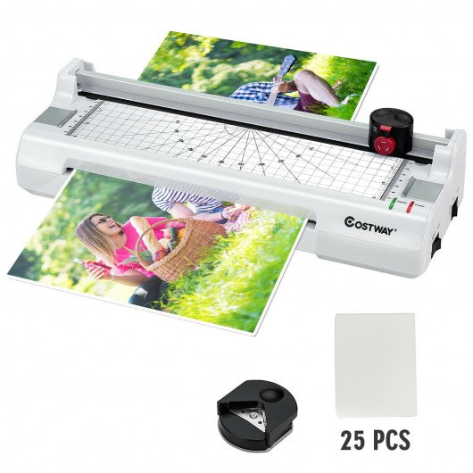 This laminator machine can help you to keep your pictures and document safe and clean! It only takes 3-5 minutes to preheat with laminating speed about 250mm/min. Various sized paper (maximum A4 paper) can be well laminated through this machine. With upgraded heating system the laminating process would be more safety to protect your machine and make it last longer year. Hot and cold lamination is alternative for different needs to make it easier and more perfect in thermal lamination. If it occurred jams accidentally you can press the pouch release button to solve it. It won't damage your machine. Equipped with 3 in 1 paper trimmer It can cut three different patterns straight perforated and waved. You can choose one of your favorite patterns to cut the pouches. The built in corner rounder which better protect your and your child's skin from being cut. Fast warm-up in 3 to 5 minutes and high laminating efficiency about 250mm/min Suitable for various paper size with maximum A4 paper Double-rail heating system let laminating process much smoother without bubbles and wrinkles Support for cold laminating and hot laminating to match different laminating sheet materials Pouch release button can help you clean paper jams 3 in 1 paper trimmer allows you to make in straight wave and perforation cut Overheating protection system can protect your machine from burning Corner rounder will prevent your fingers from being cut