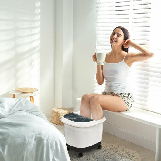 This foot bath massager is an ideal helper to relieve your foot fatigue and promote blood circulation. With motorized roller massage and shiatsu massage you can enjoy pressing and kneading at home. Red light medicine boxand shower function effectively upgrade massage experience and improve the therapeutic effect. Thanks to the heating system and temperature maintenance you can enjoy the warmth without adding extra hot water. Also the timer setting function allows you freely set the using time during 10 min to 60 min. Besides the detachable massage surfaceis easy to clean and replace and the automatic drain pipe to empty the water tank by gravity. This foot spa massager is suitable for the whole family to improve daily life quality so do not hesitate to buy it Carrying handle and universal casters for easy moving Red light and medicine box upgrade massage experience Roller massage and shiatsu massage mimic kneading and pressing Efficient heating system (up to 118℉) for warm water temperature Free using time setting function for auto shut-off 3-angle shower function for better relaxation Ideal for fatigue relieving and blood circulation promoting