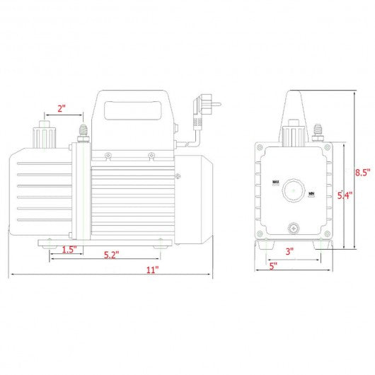 Specification: Material: Aluminum + Brass + Plastic Product weight: 17 lbs Pump weight: 11 lbs Pump dimension: 11" x 5" x 8.5" (L x W x H) Flow rate: 4 CFM Ultimate vacuum: 5 Pa Voltage: 110V/60Hz Power: 1/3 HP Package include: 1 x Vacuum pump 1 x Manifold gauge 3 x Hose 2 x Quick coupler 2 x Adapter 1 x Vacuum pump oil 1 x Suitcase 1 x Manual