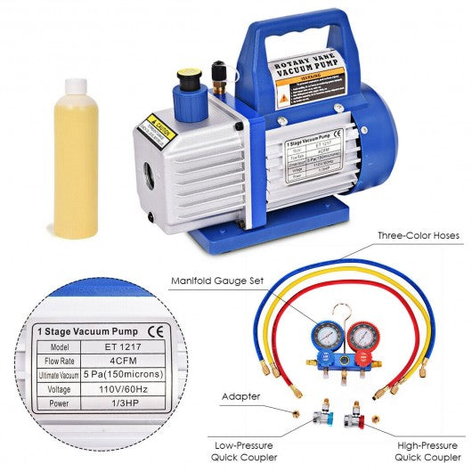 4CFM 1/3HP Air Vacuum Pump HVAC Refrigeration Kit AC Manifold Gauge Set R134