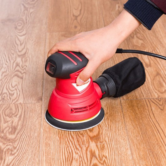 This is our professional handheld random orbit sander with high no-load speed and strong power. The 5-inch sanding surface with an 8-hole hook and loop backed base pad provides a superior smooth finish. And the 2.5 pounds lightweight design with an ergonomically designed soft-grip top allows you to utilize multiple grip positions easily. Still worrying about inhaling dust during work? This sander is equipped with a dust extractor which ensures that users will not inhale too much dust during work. Moreover it will provide you a clean work environment. Also this sander includes 6pcs 80 grit & 6 pcs 180 grit sandpaper to help you save money and meet more of your needs. All in all this product is easy to use and store making it perfect for any DIY project. Don't wait anymore! Buy one now! 13000rmp high-speed operation ensures a more efficient workflow The ergonomically designed soft-grip handle allows you to utilize multiple grip positions Lightweight design makes it easy to hold and carry Compact size for convenient storage The dust extractor reduces the amount of dust and provides you with a clean working environment Detachable dust bag makes it easy to clean and maintain 5-inch sanding surface with 8-hole hook and loop backed base pad provides a smooth finish Includes 12pcs sandpaper to help to save money and meet all your needs and requirements Labor-saving and time-saving Safety and high quality guaranteed with an ETL certification