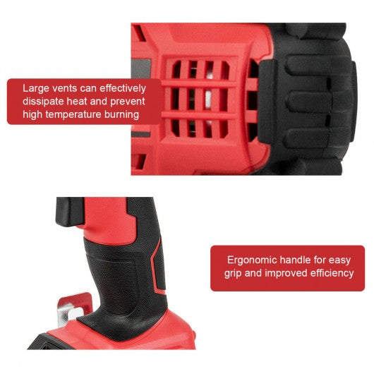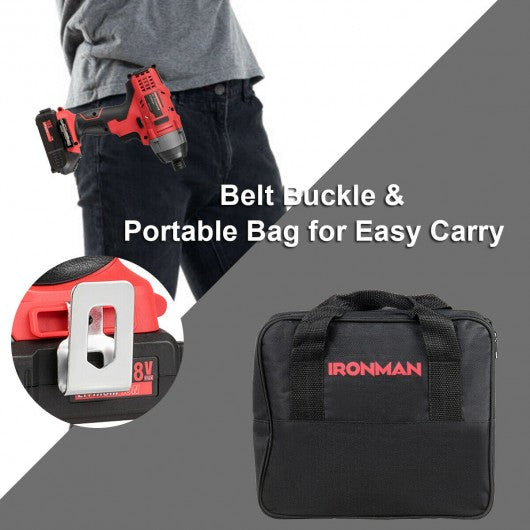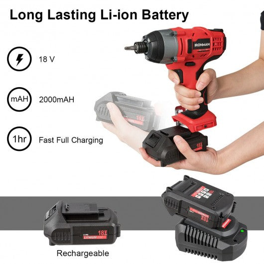 Specification: Color: Red + Black Materials: Metal Plastic Rubber Battery capacity: 18V 2000 mAh Maximum torque: 150 N.M/1327In-lbs No-load speed: 0-2200 rpm Impact force: 0-3000 BPM Full-charge time: 1 hour Overall dimension: 7" x 3" x 8.5" (L x W x H) Charger dimension: 4.5" x 4" x 2.5" (L x W x H) Battery dimension: 4.5" x 3" x 2" (L x W x H) Net weight of screwdriver: 5.5 lbs Package includes: 1 x Impact driver kit 1 x Charger 1 x Battery