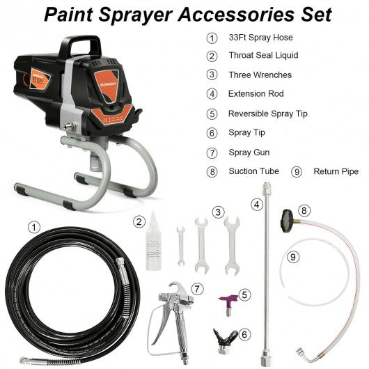 Specification: Material: Steel+Plastic Net weight: 18 lbs Power: 1100 W Rated power: 1.5 HP Maximum spray Flow: 1.5 L / min Voltage: 110 V/60 HZ Maximum pressure: 3000 psi Spray width: 6"-8" Spray hose length: 33 ft Product dimensions: 9" x 16" x 14.5" (L x W x H) Package includes: 1 x Paint sprayer 1 x Throat seal liquid 1 x Reversible spray tip 1 x Spray tip 1 x 33 ft spray hose 3 x Wrench 1 x User manual