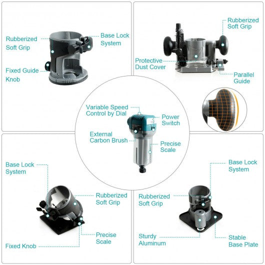 This electric palm router kit makes your woodwork more efficiently. This compact router features 6-level speed adjustment to provide different working effects. The kit comes with 4 diverse bases including fixed base tilt base offset base and plunge base. Sturdy aluminum body supports your long-term use. The transparent cover can effectively prevent the sawdust from splashing into your eyes. And a portable bag can help carry tools anywhere easily. Do your woodwork with this electric palm router. Try once! Aluminum body to ensure sturdiness and durability 710W high power for efficient work 6.5Amp motor with max horsepower of 1.25 6-level variable speed to operate from 10000 to 32000r/min Fixed base to cut with simple operation Offset base to reach corners easily Tilt base to adjust the angle between 30� and 45 � Plunge base with adjustable setting to get different cutting depth Perfect for grooving surface finishing curve cutting planning wood edge etc Dust cover to connect the vacuum cleaner External carbon brush for convenient replacement Scale on router for accurate depth adjustment Trimming guide to curve precisely 1/4" & 3/8" chuck diameter Efficient heat dissipation to prevent scalding and protect the motor Equipped with an UL approved plug