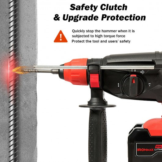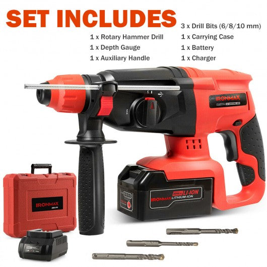 This 3-in-1 electric rotary hammer drill can effectively complete your work projects. The hammer drill has a powerful copper motor with 0-4260/min impact rate and 960 r/min no-load speed to quickly accomplish all kinds of work. 3 functions including drill mode hammer mode and hammer drill mode can apply to different working tasks with variable speed trigger to control the suitable speed by yourself. And it has a special reverse and forward switch and SDS-plus quick change drill chuck for better operation. Full drill set with 360� rotation auxiliary handle and detachable depth rod give you a lot of convenience to make the work more precise and easier. Equipped with a charger and a large capacity battery you can carry on your work at any time. This 3-in-1 electric rotary hammer drill brings convenience to your life don't hesitate to buy this product. 3 functions to switch from drill hammer drill hammer to be more multi-functional Heavy-duty copper motor is more durable and powerful 360�rotating auxiliary handle to operate easier for different needs Detachable scaled depth gauge to decide precise drilling depth Light weight and ergonomically designed handle to reduce fatigue when holding Variable speed can be controlled by your own finger Bidirectional switch can make drill forward or reverse to remove stuck drill SDS-plus quick change drill chuck has maximum impact energy transfer Safety clutch can protect the tool will guarantee the user�s safety Large capacity lithium-ion runs constantly Come with a convenient charger to always keep ready for work UL-certificated wire ensures the better quality Full drill set can meet overall needs