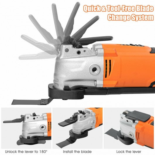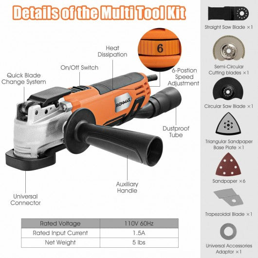 The oscillating tool kit is designed with a fast blade change system which allows you to change different kinds of blades and sandpaper. The oscillating tool kit comes with sandpaper base plate sandpapers precision saw blade circular saw blade straight saw to fulfill your different working requirements. Its powerful motor delivers strong performance and high frequency vibration while the 6 variable speeds up to 23000/min makes for precise outcome based on individual needs. In addition its good heat dissipation leaves you no worry about operation safety. And still causes less fatigue thanks to human engineering handle. Other features including dustproof tube portable carrying bag and professional design are waiting to be discovered. This oscillating tool kit a multifunctional tool that can solve all sorts of problems such as cutting board polishing metal scrapping paint sawing pipes and more. Include sandpaper base plate sandpaper several saw blades (semi-circular circular straight etc) Fast blade change system allows you to change different blades with ease Unique stabilizer beneath the lever protects your finger from pinch superior to other products Multipurpose design for cutting boards polishing surface sanding metal sawing pipes and more 6 variable speeds (15000-23000/min) meet different working requirements Powerful motor delivers strong performance for higher efficiency Excellent heat dissipation ensures operation safety and prolongs service time User-Friendly dustproof tube for clean working environment in case of too much dust Human engineering handle takes the comfortable of gripping to the next level Unique stabilizer beneath the lever protects your finger from pinch superior to other products Carrying bag convenient storage and portability
