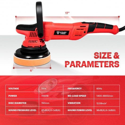 Specification: Color: Black Red Length: 17" Cord length:9.8 ft Net weight: 7 lbs Voltage: 110 V Frequency: 60 Hz Power: 1100 W No-load speed: 1400-4800/min Polishing pad diameter: 6 inch Eccentricity:21mm Package includes: 1 x Car polisher 3 x Sponge pads 1 x D-shaped handle 1 x Side handle 2 x Carbon brushes 1 x Hexagon wrench 1 x User manual