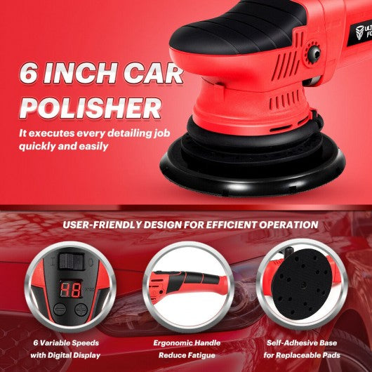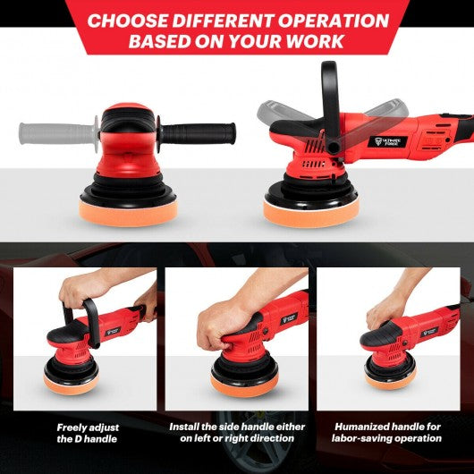 Polish and wax your vehicle with this dual action random orbital polisher. It comes with 3 replaceable polishing sponge pads black for coarse polishing effect orange for medium and white for fine that fulfill different working requirements. And its high quality motor generates strong power to help you improve the work efficiency while good heat dissipation ensures safety operation. There are 2 detachable handles as well 1 side handle and 1 D handle ergonomically designed to reduce your hand fatigue during working. Furthermore the polisher can be applied to different materials such as marble tile furniture and ships. It is worth mentioning that this orbital polisher is superior to the ordinary one since it can polish large area without any glare to deliver better perfect performance. If you are looking for such polisher kit why not try? 1100W powerful motor for the most demanding applications 6 Variable speeds from 1400 rpm to 4800rpm with digital display for better view Detachable side handle and D-shaped handle meet different work requirements Ergonomically designed handle non-slip comfortable for lasting gripping Dual action random orbital polisher larger polishing area without glare Soft start and good dissipation for a safety operation 3 Sponge polishing pads for coarse medium and fine polishing Perfect for polishing waxing the car furniture ship marble tile etc Quick carbon brush change system for good maintenance