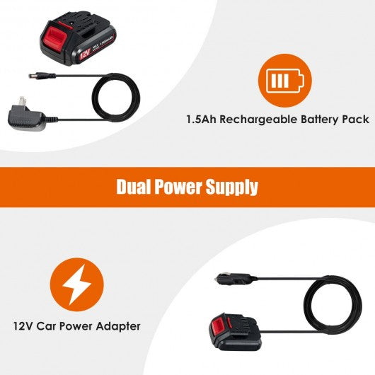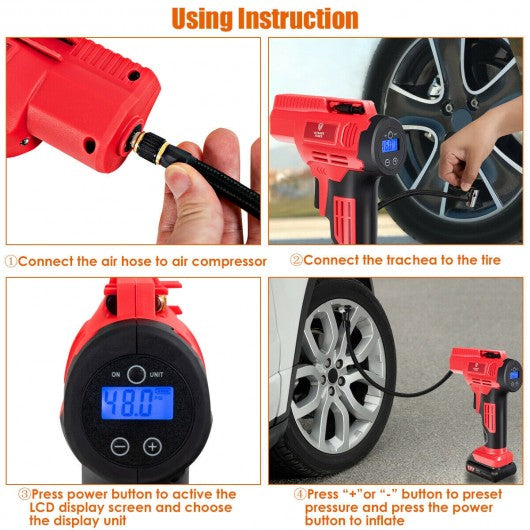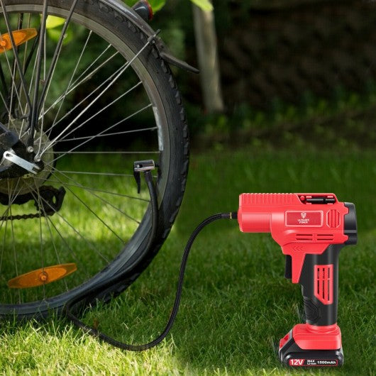 This cordless air compressor is suitable for inflating car tires or bicycle tires balls and other inflatable items. It will be convenient for you to carry with the inflator because of its mini size. And it has strong power which will make your tire inflation fast in few minutes. The car pump with LCD digital pressure gauge shows 4 units including PSI BAR KPA and KG / CM� helping preset tire pressure precisely. Featuring automatic stop function the inflator will the pressure reaches preset pressure so as to avoid over inflation. What's more except the 15Ah rechargeable Lithium battery the air inflator also comes with a 12V car power adapter for you to use conveniently. When you are in dark environment the LED light will light up the road for you. Bring it to your home. Let it make your life better! 150 PSI powerful electric motor make your tire inflation fast �Auto Shut Off� function automatically stop ensure your safety Digital pressure gauge makes you easily read the pressure even at night Emergency LED light can light up the road even in the darkest place Presetting function is safer and more convenient Support two charging ways; come with rechargeable Li-ion battery & 12v car power adapter Portable design easy to carry with does not take up much storage space Cordless design is suitable for travelling and driving