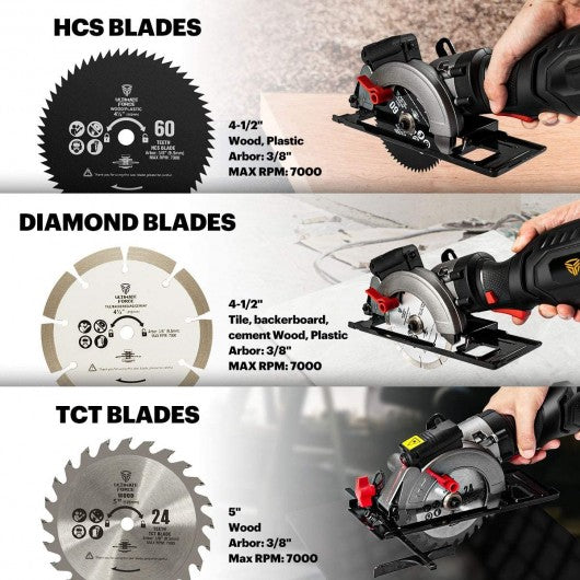 This 750W mini circular saw will be perfect solution for you in search of a professional as well as multifunction circular saw for precise cuts. It features quick blade change system and you will be skilled in replacing different kinds of blades by means of hex wrench included in minutes. Meanwhile it also comes with 6 blades 2x24T TCT (5") for wood cuts 2x60T HCS(4-1/2") for wood and plastic cuts 2x diamond blades for tile backerboard and cement cuts. To achieve precise cutting line you can start the laser guide and install the scale ruler provided. To meet your cutting demand of different cutting depth you can adjust the cutting depth spanner. While the 0�-45� bevel cutting bring much more convenience in operation as well. No hand fatigue anymore since it is designed with ergonomic grip handle which is capable of providing comfortable gripping feeling. Bring this multifunctional saw home and simplify cutting job.Let's buy it now! Come with 6 blades with different types with sizes for different cutting demands Easy to change the blade in minutes in the guidance of the detailed instruction Achieve adjustable cutting depth and 0�-45� bevel cutting by means of corresponding spanner Max cutting depth: 1-9/10'' at 90� 1-1/4'' at 45� (5" blade) 1-11/16" at 90� 1-1/8'' at 45� (4-1/2''blade) Independent laser guide with 2 button cell batteries provides Both the laser guide and scale ruler for precise and straight cutting line Lightweight design and ergonomic grip handle for one-hand operation without fatigue Safety switch for safer operation in case of accidence Pure chopper motor for stronger power up to 3600 rpm Extended metal base plate for improved stability during operation Removable dust tube can be connected to vacuum cleaner for clear working environment