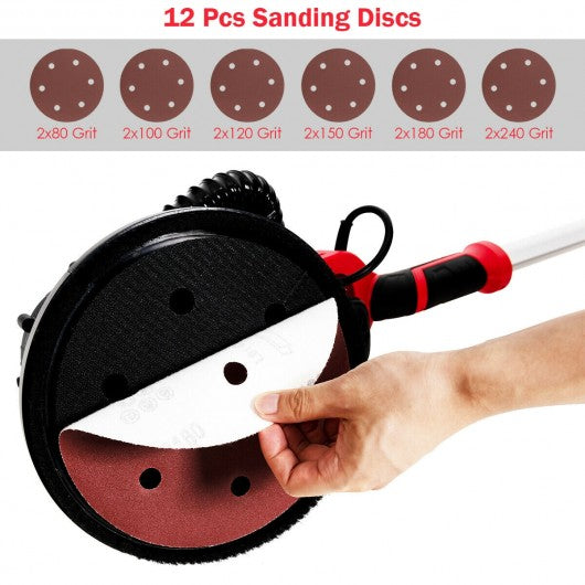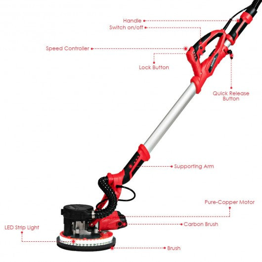 This drywall sander is a good helper for sanding walls and ceilings. Featuring an automatic vacuum system this sanding machine can provide a dust-free workplace even without a vacuum cleaner. 750W high power copper motor with 5 variable speed helps you efficiently grind the wall. With its telescopic handle this professional polishing machine can extend from 55" to 77�� allowing you to easily grind the ceiling even when standing on the ground. At the bottom of the sanding head there is also a detachable chassis edge. You can easily remove it to grind corners or perpendicular walls. At the same time this drywall sander is also equipped with LED lights to adapt to the dim place. Coming with 12 sandpapers 2 carbon brushes and more this professional polishing machine ensures that you have all the tools needed to tackle any sanding task. Do not hesitate to buy this product for your family! 750W powerful motor to provide efficient power 5 variable speed to be adjusted from 800 to 1500rpm Automatic vacuum system with dust bag and hose offers a dust-free workplace Detachable sanding disk enables you to grind corners or perpendicular walls easily LED lights around the bottom plate allow for working in the dark The extendable handle makes it possible to sand ceilings and other high places 12 sandpapers 1 vacuum bag 2 carbon brushes 1 carrying bag and more are included Equipped with UL approved plug for safe use