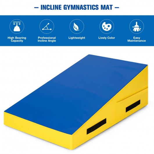This new incline wedge ramp gym mat is ideal for aerobic exercising and tumbling. The material feels comfortable for workouts. You can play with this ramp mat at home or in the office. The fashionable color and sturdy and durable construction with high-quality foam filled inside are very attractive. The Zip-closed design is easy for cleaning up and disassembly of cover. It is excellent for tumbling exercise programs gymnastics stretching yoga martial arts daily care activities and other uses. If you are looking for a ramp gym mat like this do not hesitate to place an order! Brand new and high quality Sturdy and durable construction Non-toxic and tasteless PVC cover and EPE pearl foam inside Suitable incline angle for comfortable exercise Zip-closed design for easy cleanup and disassembly of cover
