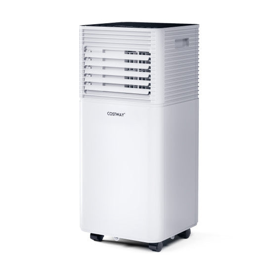 This 3-in-1 10000 BTU portable air conditioner is a perfect cooling appliance for your home! Rated at 10000 BTU and with a high air flow of 330 m³/h this air cooler unit can efficiently cool areas up to 350 square feet. This air cooler combines 3 functions in one piece including cooling ventilating and dehumidifying. Under the dehumidifying mode it can remove up to 50 liters of moisture per day to keep your room dry and clean. Besides under the fan mode you can set high fan speed or low fan speed as you wish. To provide clean cool air our air conditioner is designed with a removable and washable filter screen. The 24-hour timer and quiet sleep mode can provide you with a peaceful and comfortable sleep. In addition the handy remote clear LED display and touch panel allow you to control the air cooler with ease. With 4 universal wheels you can easily move it to your living room bedroom dining room etc. If you are looking for a 10000 BTU portable air conditioner like this do not hesitate to place an order! Air conditioner with 10000 BTU cooling capacity can cool down an area of 350 sq.ft. Low-noise sleep mode and smart 24-hour timer function ensure you a good sleep The louver can be manually adjusted up & down 70° 30° to the right 20° to the left 3-in-1 multifunctional design includes air cooler fan and dehumidifier 4 modes and 2 wind speed adjustment to meet different needs Removable and washable filter screen helps to improve air quality Manual oscillating function offers wide-angle air supply Remote control and smart touch panel for convenient use Auto defrosting function and self-evaporating system for higher efficiency Auto shut off when tank full & auto restart in the event of power outage Equipped with 4 universal casters and built-in handles for easy movement Adjustable window kit is included to match various windows Child safety lock prevents potential accidents