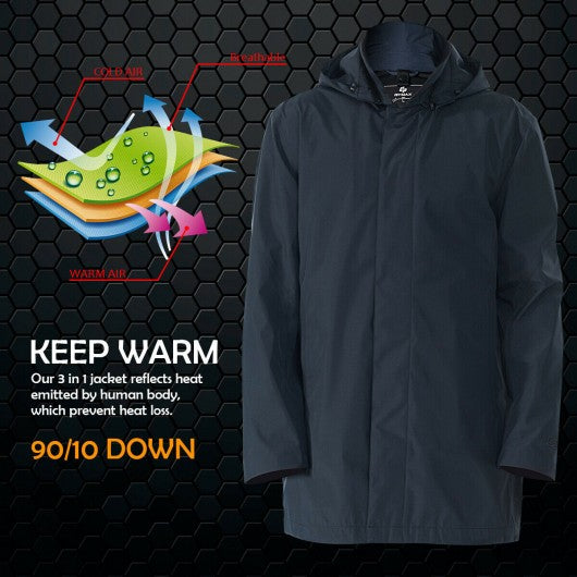 The whole jacket comes with multiple zippered pockets for safe storage of your cards or phones. And we only use the first-class YKK zippers which you will see our pursuit of details. We've got you a practical 3 in 1 jacket here would you like to take a look? It's a two-piece suit that you can wear the outer shell alone or the down jacket alone in spring and fall and you can wear both together in winter to keep warm. Isn't it practical? More to say is that the fabric is waterproof and windproof since it adopts seam taping craft to help it better seamless. The whole jacket comes with multiple zippered pockets for safe storage of your cards or phones. And we only use the first-class YKK zippers which you will see our pursuit of details. Plus there is a detachable hood which can be adjusted with a drawstring and you can remove it when you don't have one. It's so practical a jacket that features a simple business style and you won't miss it. If you are looking for a practical 3 in 1 jacket don't hesitate to get it for warm! Two-piece suit with three ways of wearing it Selected fabric comes with a waterproof index that reaches up to 8000mm/H2O and moisture-penetrability of 1500g/m2/24hr Seam taping enhances its windproof and waterproof effect Filling with 90% water repellent duck down for better warm performance and which dry faster in wet environments than ordinary ones Detachable hood with adjustable drawstring Use premium YKK zippers for the whole jacket Machine washable and won�t fade easily which has passed the AATCC standard The simple business style that suits a variety of occasions Tips for Clean and Care: a. Machine wash cold and tumble dry low b. Please do not bleach iron or dry clean c. Please wash with like colors d. The highest washing temperature shall not exceed 30 ?(86?) e. Please close all fasteners before wash